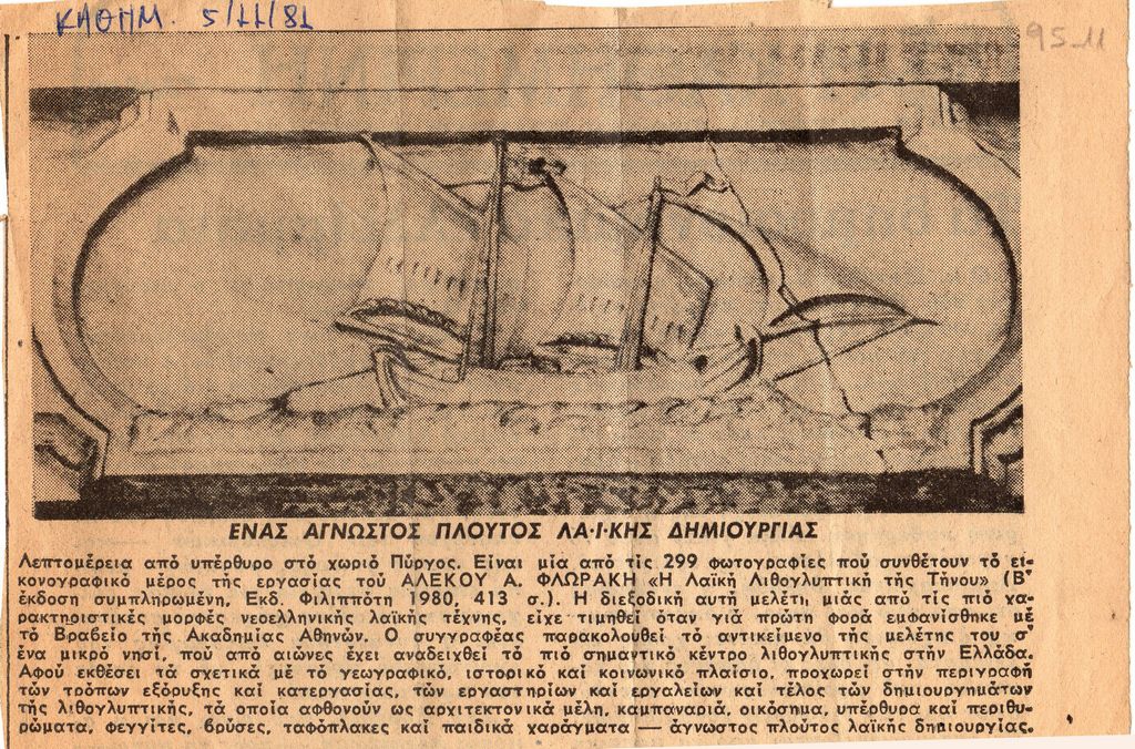 Απόκομμα, χαρτί, 11.5×16.5 εκ., στα ελληνικά, δημοσίευσης άρθρου αναφερόμενου στην κυκλοφορία έκδοσης του Αλέκου Φλωράκη με τίτλο “Η Λαϊκή Λιθογλυπτική της Τήνου”. Δίνονται σχετικές πληροφορίες. Το απόκομμα εικονογραφείται και φέρει επιγραφή.