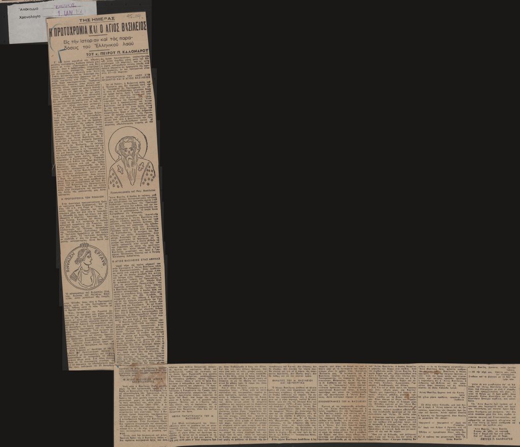 Απόκομμα, χαρτί ακανόνιστου μεγέθους, στα ελληνικά, δημοσίευσης άρθρου για τον Άγιο Βασίλειο και την Πρωτοχρονιά.