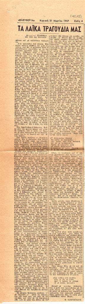 Απόκομμα, χαρτί, 2 φφ, στα ελληνικά, δημοσίευσης άρθρου αναφερόμενου στο λαϊκό τραγούδι και τη σχέση του με την έκφραση των ανθρώπινων συναισθημάτων.