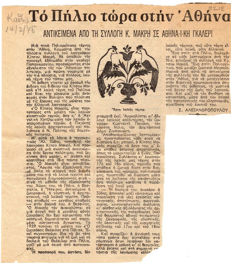 Απόκομμα, χαρτί ακανόνιστου μεγέθους, στα ελληνικά, δημοσίευσης άρθρου αναφερόμενου σε έκθεση τμήματος της συλλογής του Κίτσου Μακρή, λαογράφου, η οποία διεξάγεται στην Γκαλερί Παπαγεωργίου.