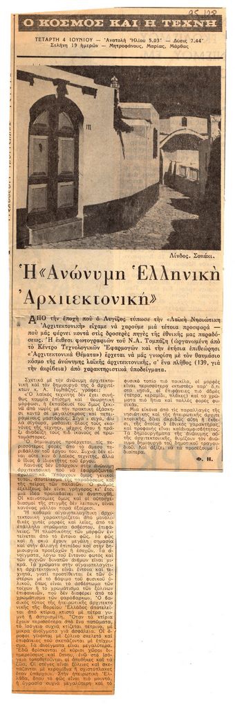 Απόκομμα, χαρτί ακανόνιστου μεγέθους, στα ελληνικά, δημοσίευσης άρθρου αναφερόμενου σε έκθεση φωτογραφίας του Α. Τομπάζη, όπου παρουσιάζονται παραδείγματα της ανώνυμης λαϊκής αρχιτεκτονικής.