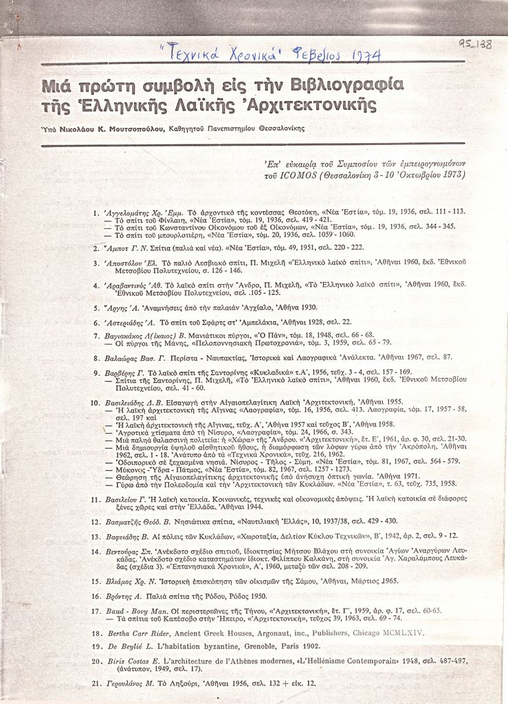Φωτοαντίγραφο, χαρτί, 10 φφ, 30×21 εκ., στα ελληνικά, δημοσίευσης βιβλιογραφίας για τη Λαϊκή Αρχιτεκτονική στην Ελλάδα.