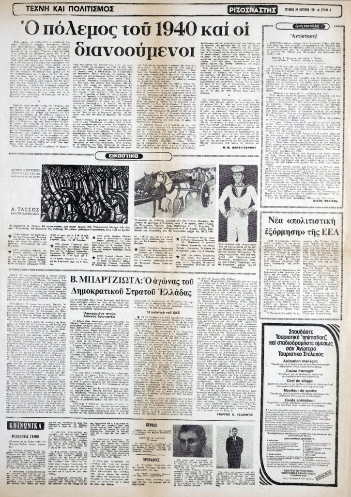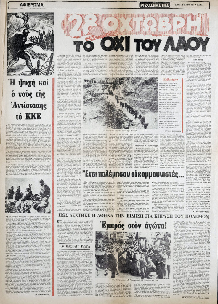 Απόκομμα της εφημερίδας “Ριζοσπάστης” (28/10/1981), όπου δημοσιεύεται αφιέρωμα στην εθνική επέτειο της 28ης Οκτωβρίου 1940. Στο ίδιο απόκομμα δημοσιεύονται επίσης τα άρθρα: “Η ψυχή και ο νους της Αντίστασης το ΚΚΕ”, “Πως δέχτηκε η Αθήνα την είδηση για κήρυξη του πολέμου”, “Ο πόλεμος του 1940 και οι διανοούμενοι”, “Ο αγώνας του Δημοκρατικού Στρατού Ελλάδας”, “Αντίσταση!”.