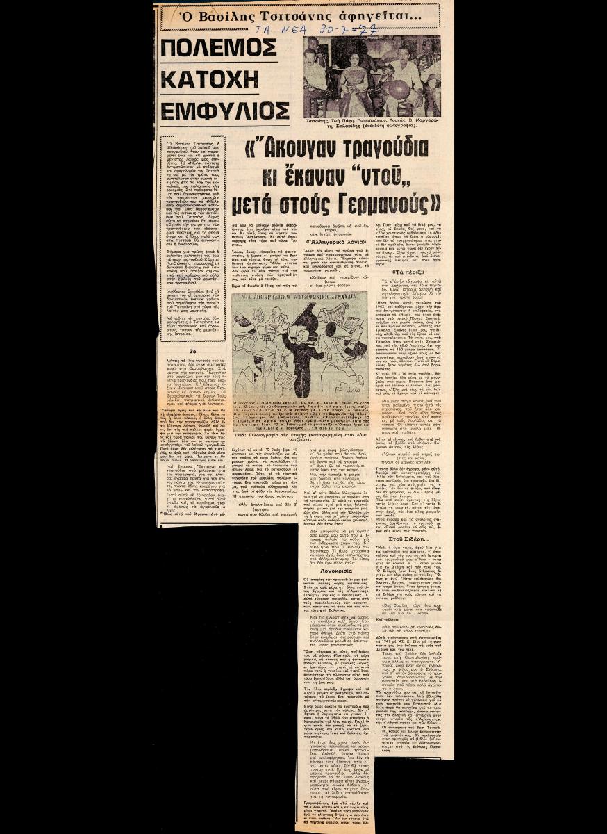 Απόκομμα της εφημερίδας “Τα Νέα” (30/07/1977).