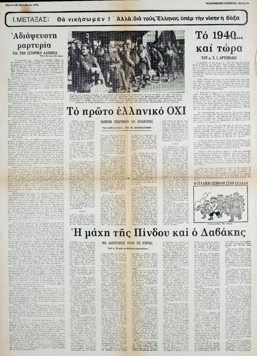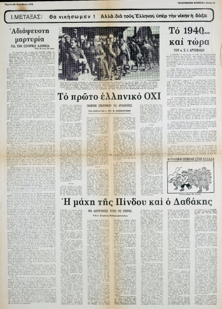Απόκομμα της εφημερίδας “Ελεύθερος Κόσμος” (28/10/1976), όπου δημοσιεύονται τα ακόλουθα άρθρα με αφορμή την επέτειο της 28ος Οκτωβρίου 1940. Στο ίδιο απόκομμα: Απόστολος Δασκαλάκης “Το Πρώτο Ελληνικό ΟΧΙ”, Α-υτη Κ-οου “Αδιάψευστη μαρτυρία για την ιστορική αλήθεια”, Σ.Ι. Αρτεμάκης “Το 1940 … και τώρα”, Στρ. Καλογερόπουλος “Η μάχη της Πίνδου και ο Δαβάκης”.