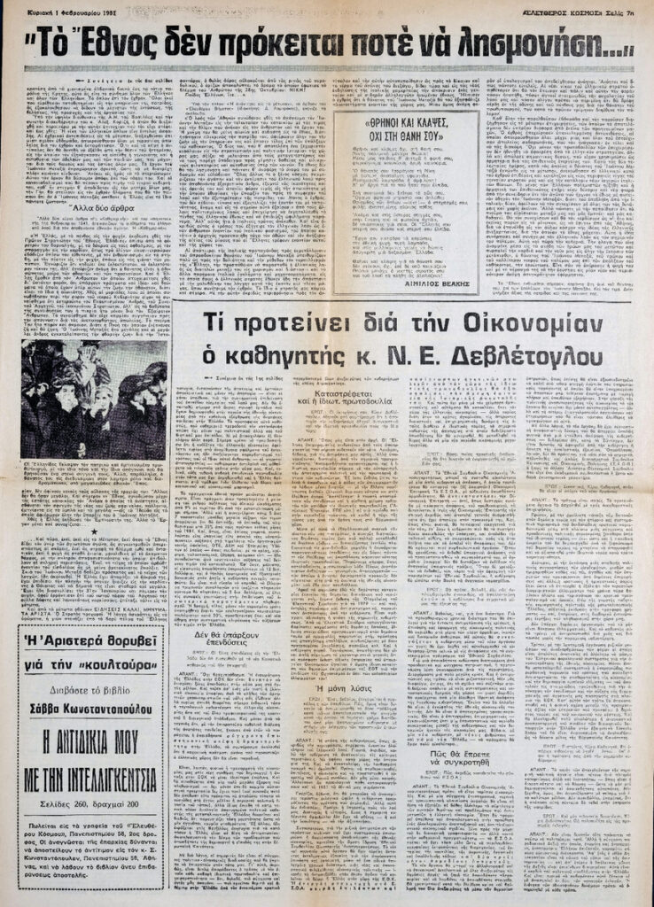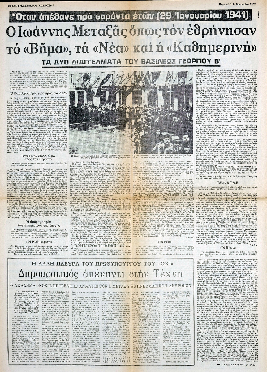 Απόκομμα της εφημερίδας “Ελεύθερος Κόσμος” (01/02/1981). Στο ίδιο απόκομμα: Π. Πρεβελάκης “Δημοκρατικός απέναντι στην Τέχνη. Ο ακαδημαϊκός Π. Πρεβελάκης αναλύει τον Ι. Μεταξά ως πνευματικόν άνθρωπον”, “Αθηναϊκές μνήμες”, Α. Σακελλάριος “Στα χρόνια της Κατοχής”.