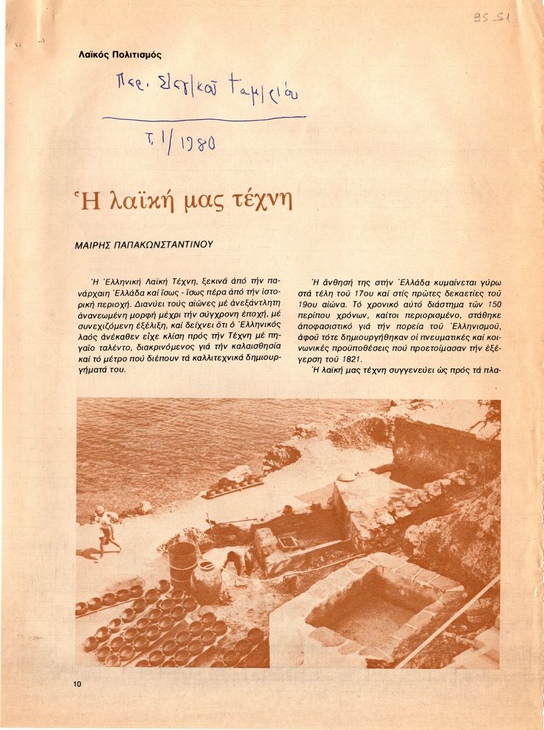 Απόκομμα, χαρτί, 2 φφ, 28×20.5 εκ., στα ελληνικά, δημοσίευσης άρθρου αναφερόμενου στη λαϊκή Τέχνη στην Ελλάδα. Δίνονται τα βασικότερα χαρακτηριστικά της.