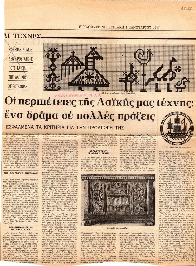 Απόκομμα, χαρτί, 35×25 εκ., στα ελληνικά, δημοσίευσης άρθρου αναφερόμενου στα προβλήματα που δημιουργούνται γύρω από τη λαϊκή Τέχνη. Εδικότερα, γίνεται λόγος για την εκβιομηχάνισή της, την έλλειψη νομοθεσίας προστασίας των έργων αλλά και την προσπάθεια ίδρυσης Λαογραφικών Μουσείων.