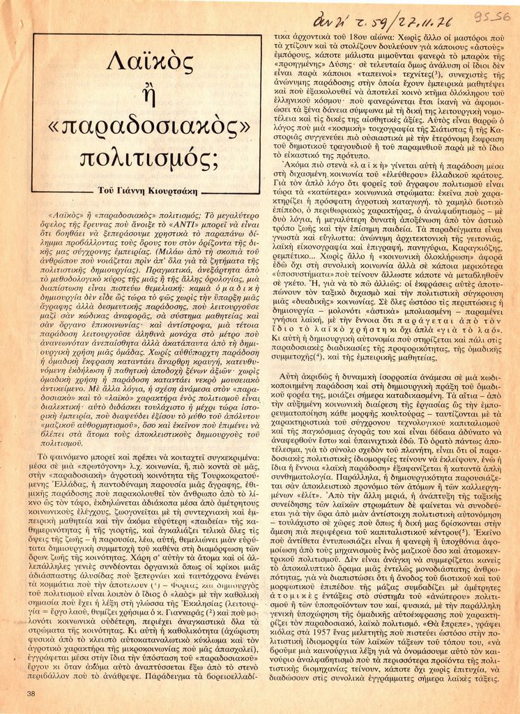 Απόκομμα, χαρτί, 2 φφ, 28.5×21 εκ., στα ελληνικά, δημοσίευσης άρθρου αναφερόμενου στον “λαϊκό” και “παραδοσιακό” πολιτισμό. Εξηγούνται οι όροι και γίνεται προσπάθεια διάκρισής τους.