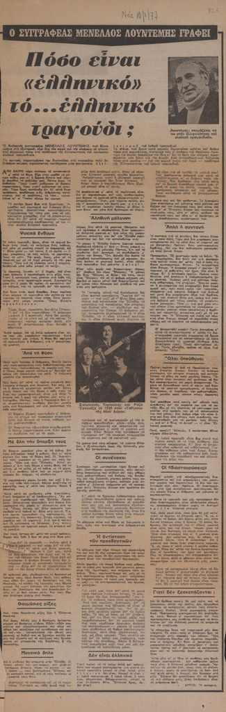 Απόκομμα, χαρτί, 62×20 εκ., στα ελληνικά, δημοσίευσης άρθρου αναφερόμενου στην ελληνικότητα του λαϊκού τραγουδιού.