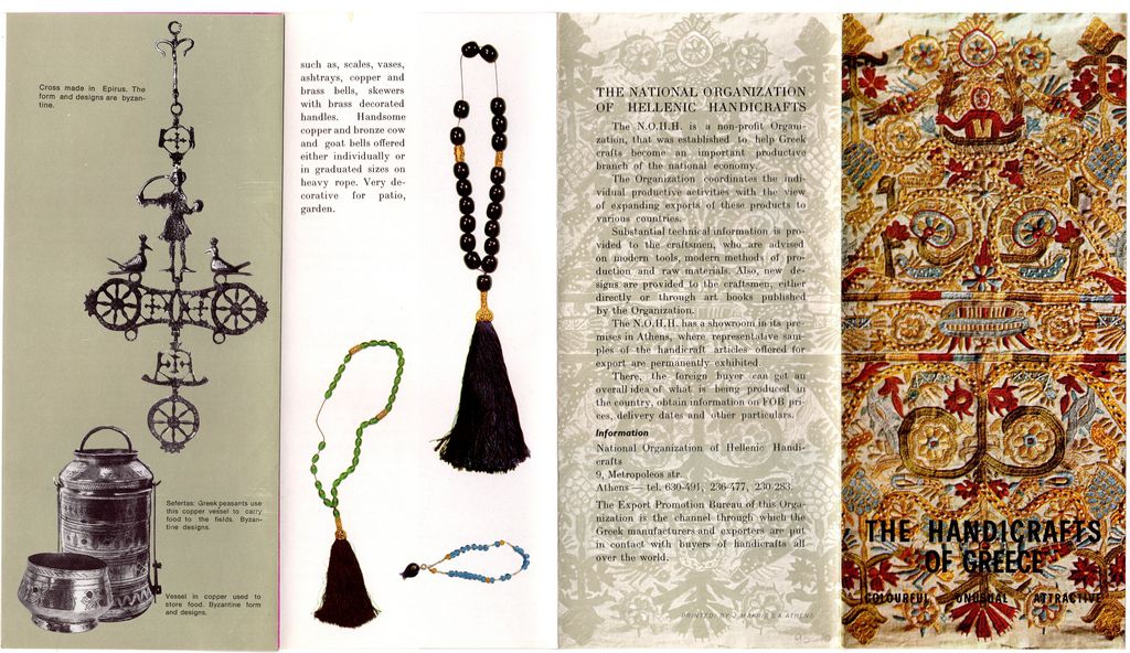 Έντυπο, χαρτί πολύπτυχο, 22×9.5 εκ., στα αγγλικά, διαφήμισης αντικειμένων λαϊκής τέχνης, από την Οργάνωση Ελληνικής Χειροτεχνίας.