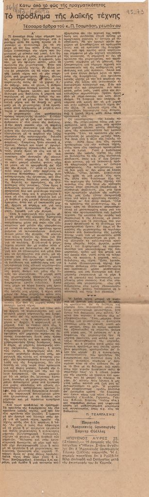 Απόκομμα, χαρτί, 41×12,5 εκ., στα ελληνικά, δημοσίευσης άρθρου αναφερόμενου στη λαϊκή Τέχνη. Επιχειρείται ο ορισμός του όρου και η διασαφήνιση αναφορικά με το τι εντάσσεται σε αυτήν.