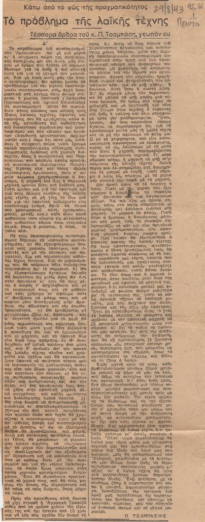 Απόκομμα, χαρτί, 29,5×12 εκ., στα ελληνικά, δημοσίευσης άρθρου αναφερόμενου σε συνεταιρισμούς υφαντικής και άλλων κατηγοριών λαϊκής τέχνης, που συμβάλλουν στην προώθησή της.