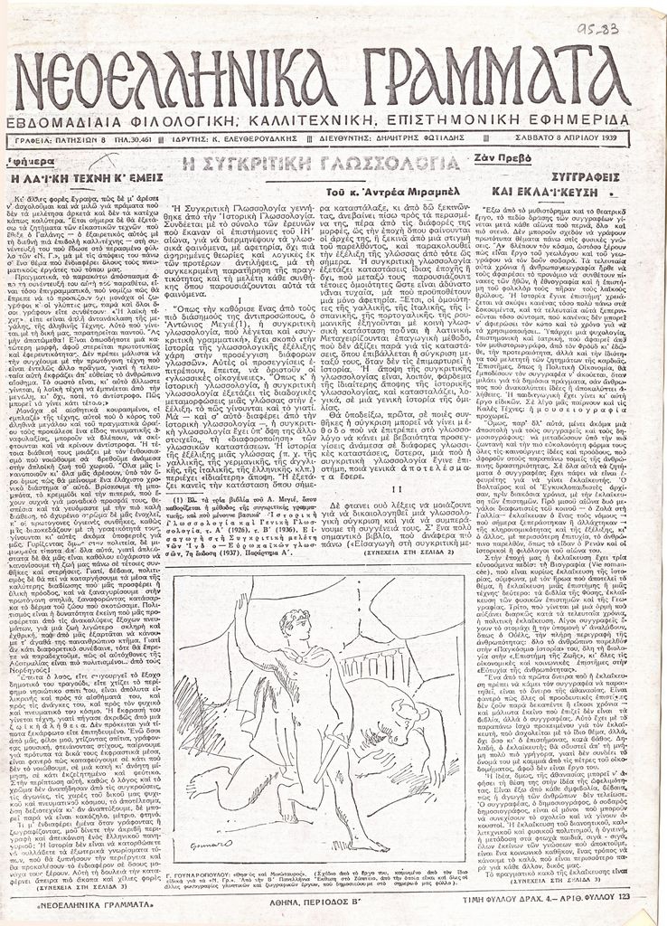 Στο ίδιο, άρθρα για τη γλωσσολογία με τίτλο “Η Συγκριτική Γλωσσολογία” και για τη λογοτεχνική εκλαϊκευση με τίτλο “Συγγραφείς και Εκλαΐκευση”.
