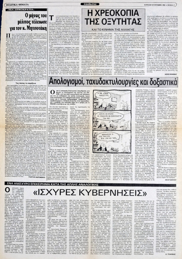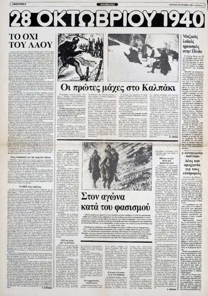 Απόκομμα της εφημερίδας “Ριζοσπάστης” (28/10/1984), όπου δημοσιεύεται αφιέρωμα στην εθνική επέτειο της 28ης Οκτωβρίου 1940. Δημοσιεύονται τα άρθρα: Μ. Καρκάνης “Το όχι του λαού”, Στ. Παππάς “Οι πρώτες μάχες στο Καλπάκι”, “Στον αγώνα κατά του φασισμού”.