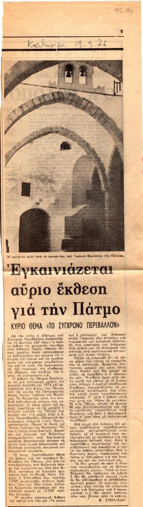 Απόκομμα, χαρτί, 41,5×11,5 εκ., στα ελληνικά, δημοσίευσης άρθρου αναφερόμενου σε έκθεση με τίτλο “Η Πάτμος στο Σύγχρονο Περιβάλλον”, στην Αίθουσα Τέχνης Αθηνών.