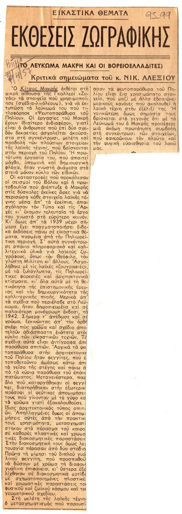 Απόκομμα, χαρτί ακανόνιστου μεγέθους, στα ελληνικά, δημοσίευσης άρθρου αναφερόμενου σε έκθεση του Κίτσου Μακρή, με το υλικό που χρησιμοποίησε για να εκτυπώσει λευκωμά του με τίτλο “Ψευτοπαράθυρα του Πηλίου”.