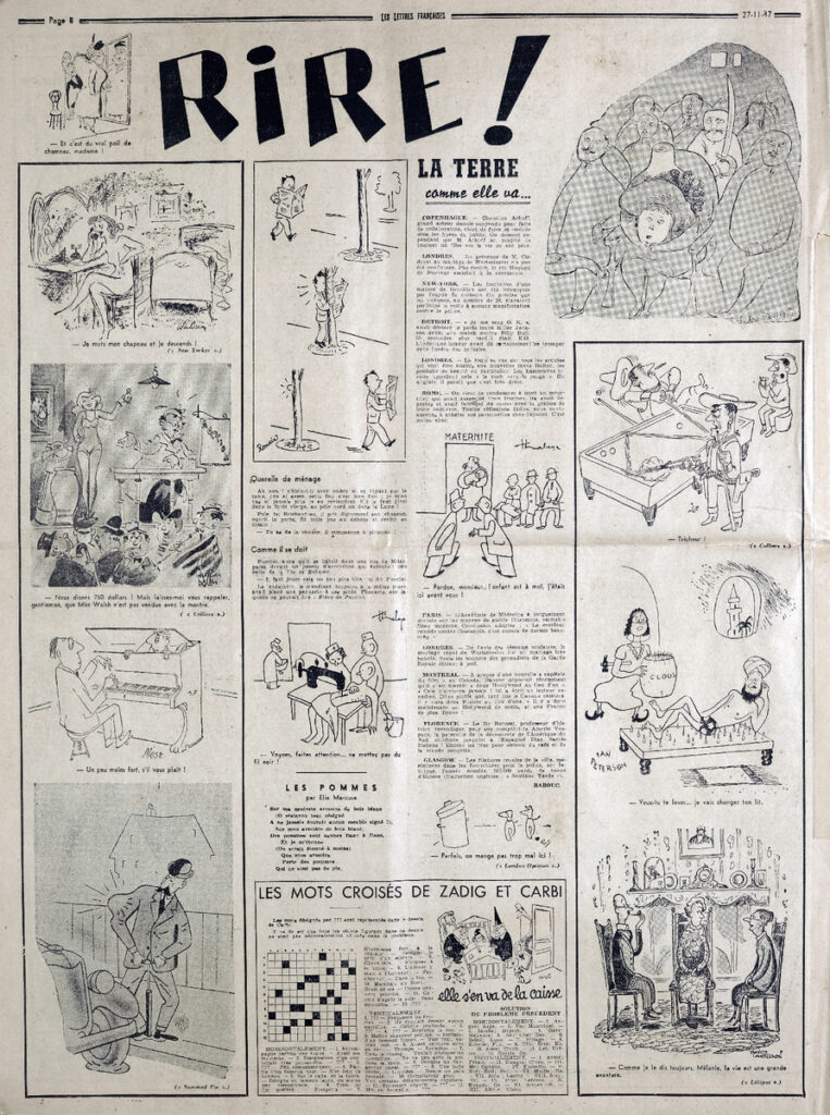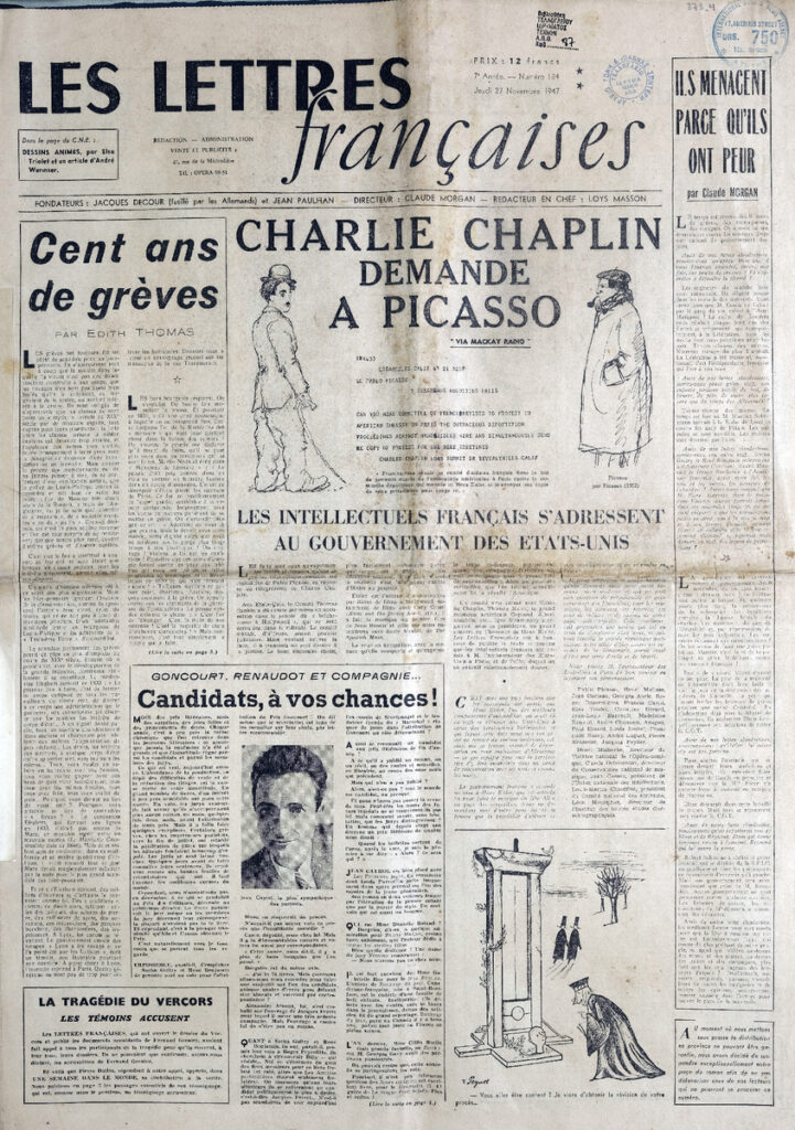 Απόκομμα, έντυπο, στα γαλλικά, χαρτί, δύο όψεις, 60×37,5 εκ., στα γαλλικά, όπου δημοσιεύονται άρθρα με τίτλου: “Charlie Chaplin demande à Picasso”, “Dessins animés”.