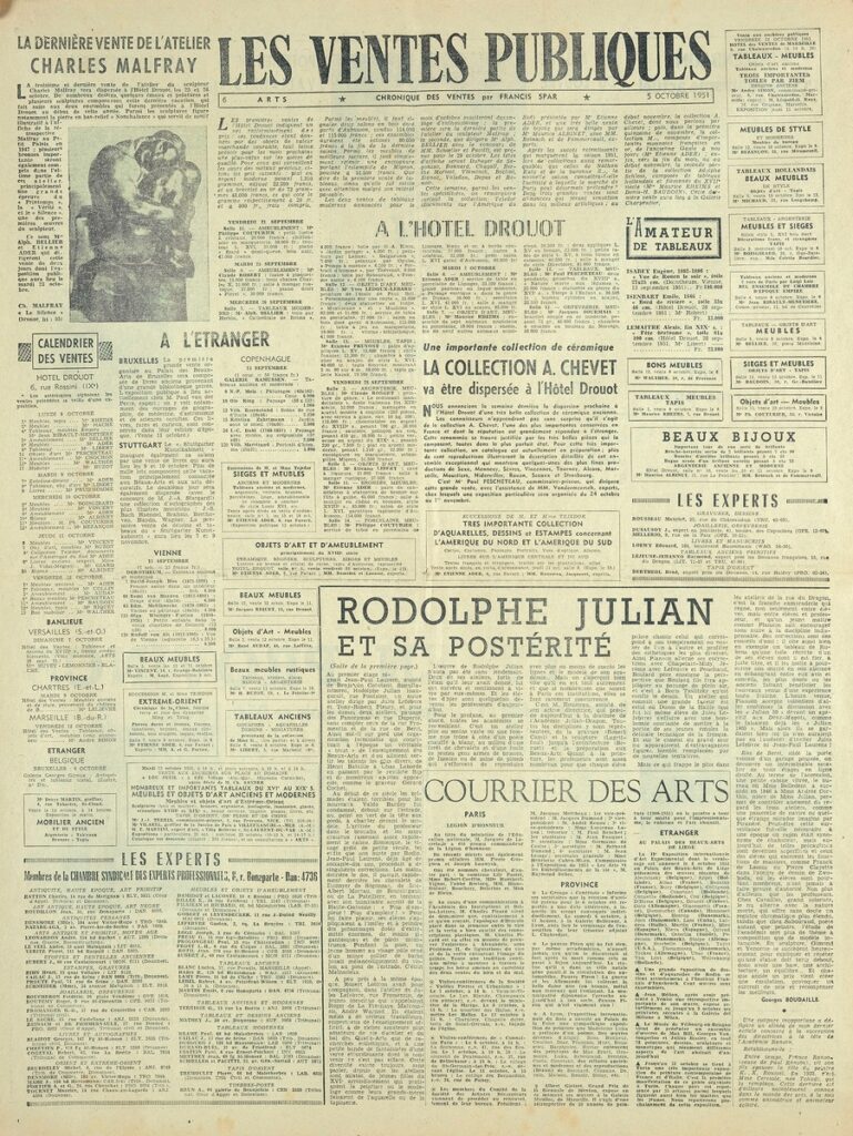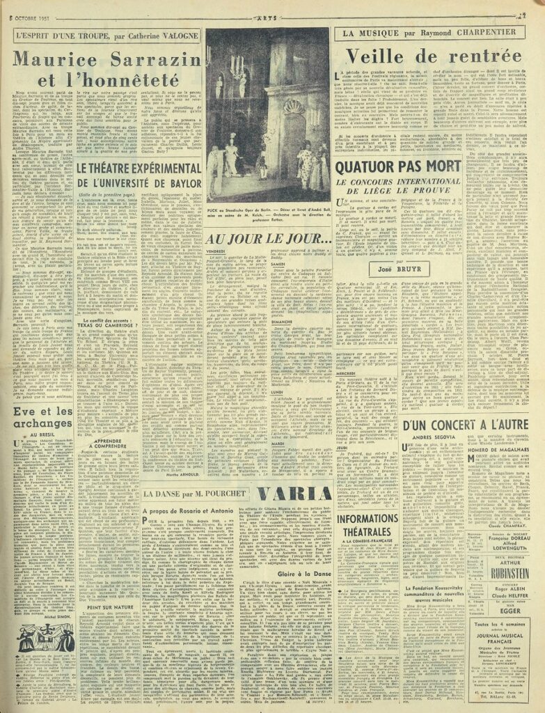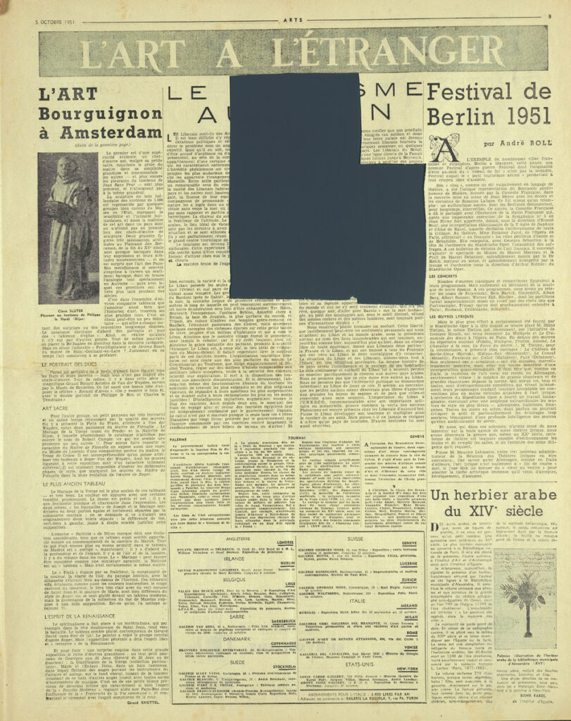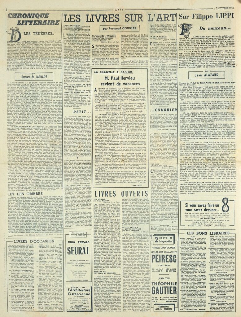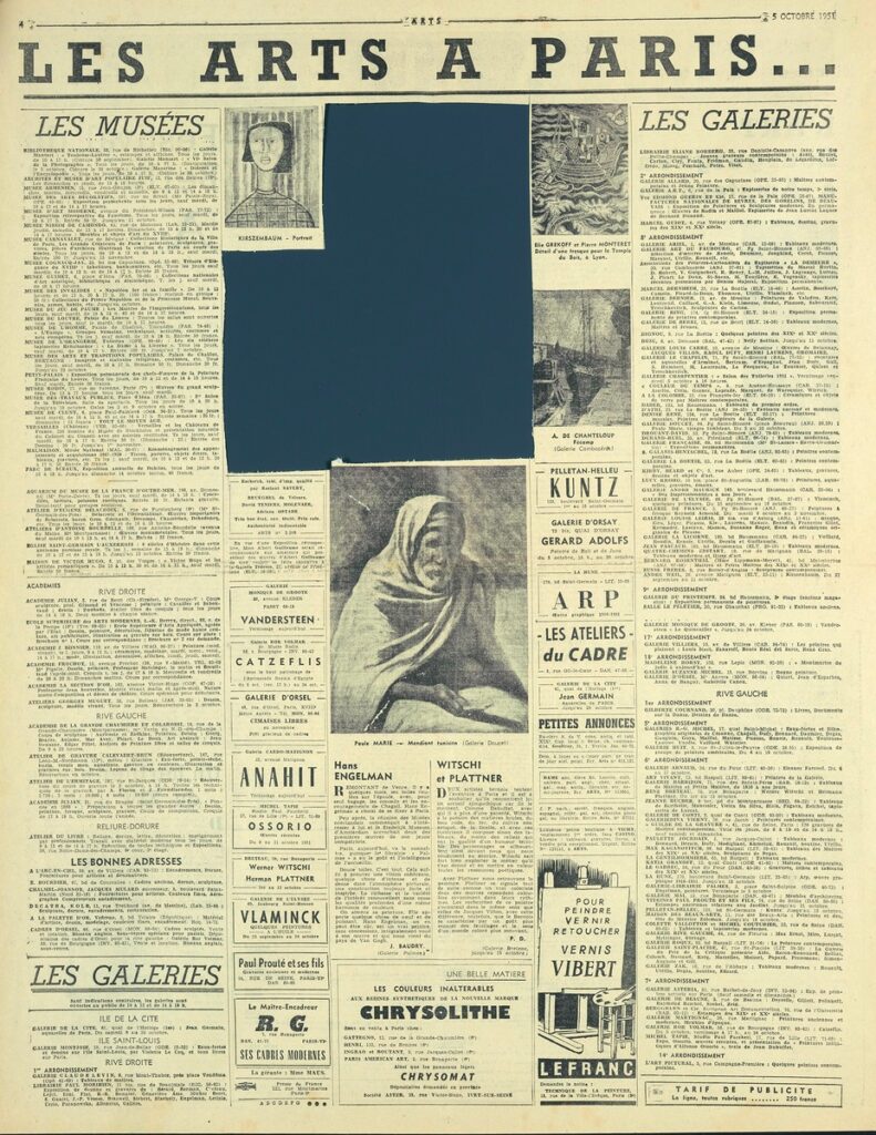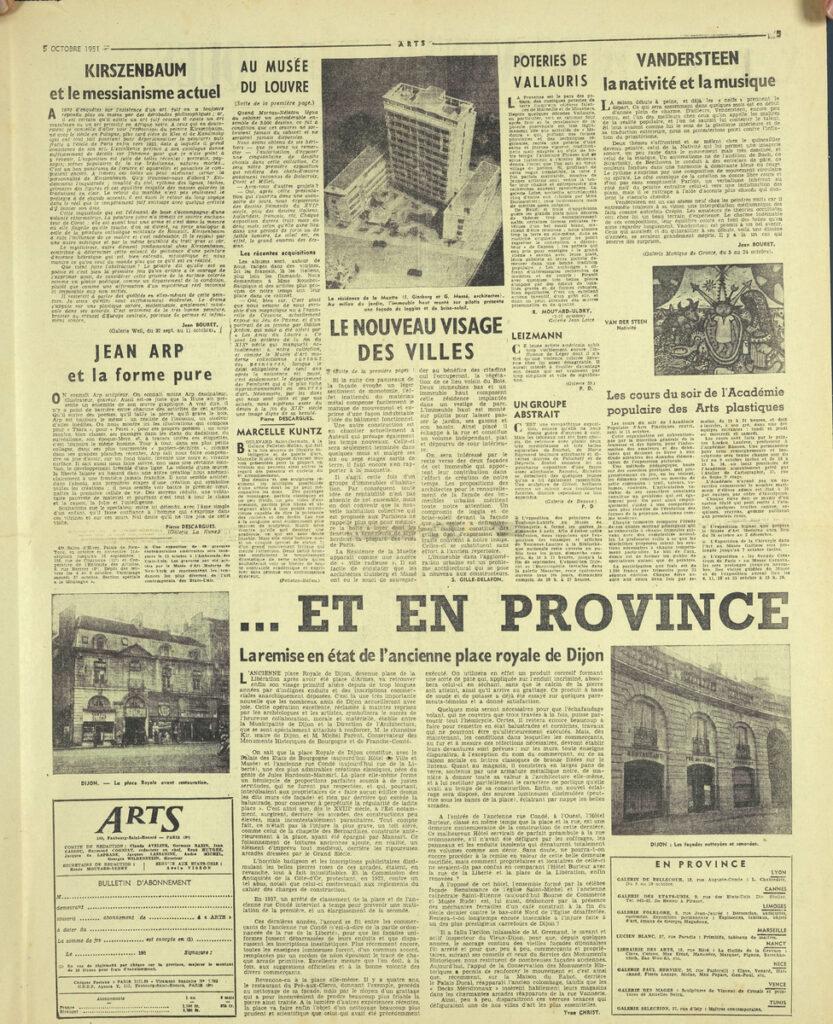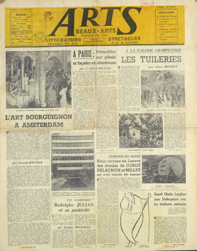 Έντυπο, στα γαλλικά, χαρτί, 4 φύλλα, 8 σελίδες, 56×43 εκ., όπου δημοσιεύονται άρθρα με τίτλους: “Le Art Bourguignon a Amsterdam”, “A Paris: Immeubles sur pilotis et façades en aluminium”, “A la Galerie Charpentier. Les Tuileries”, “Nous verrons au Louvre des dessins de Corot, Delacroix et Millet qui ne ont jamais été exposés”. Το τεκμήριο εικονογραφείται.