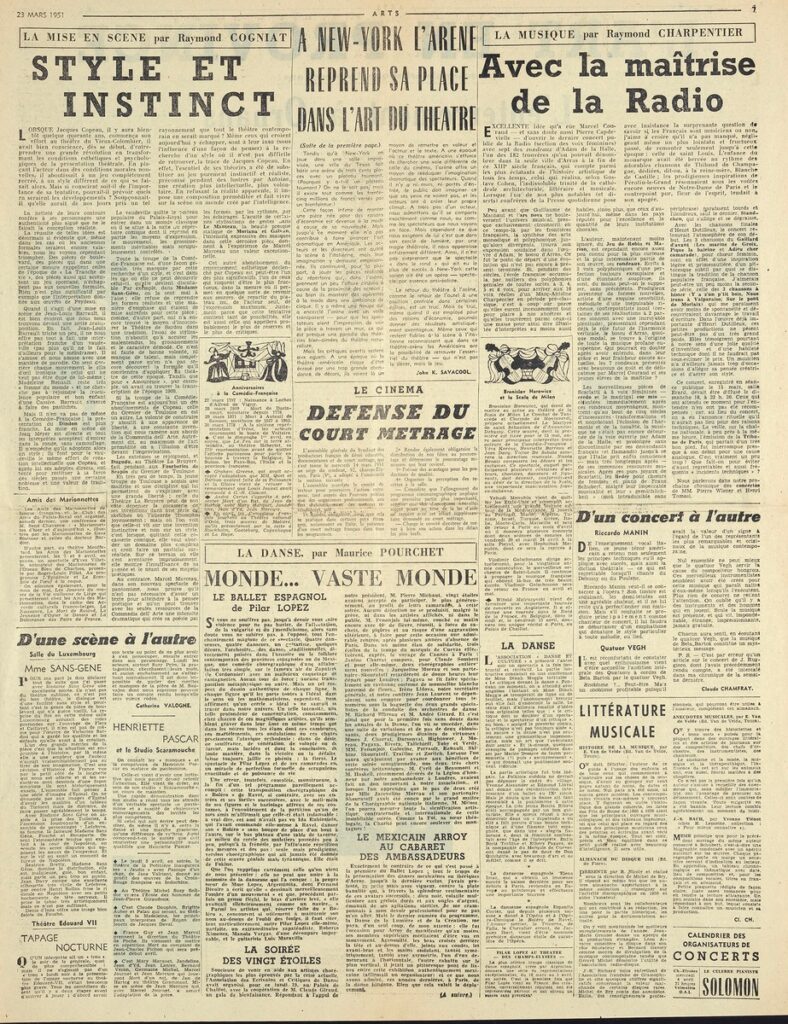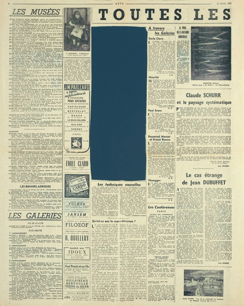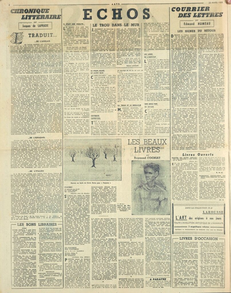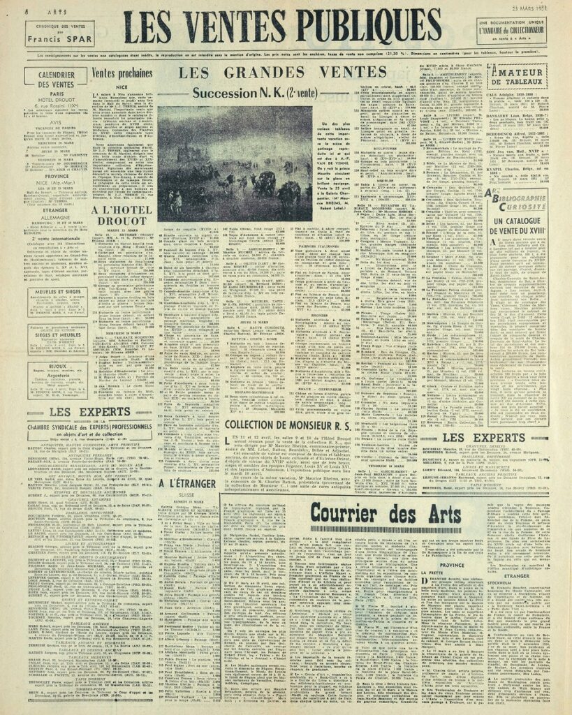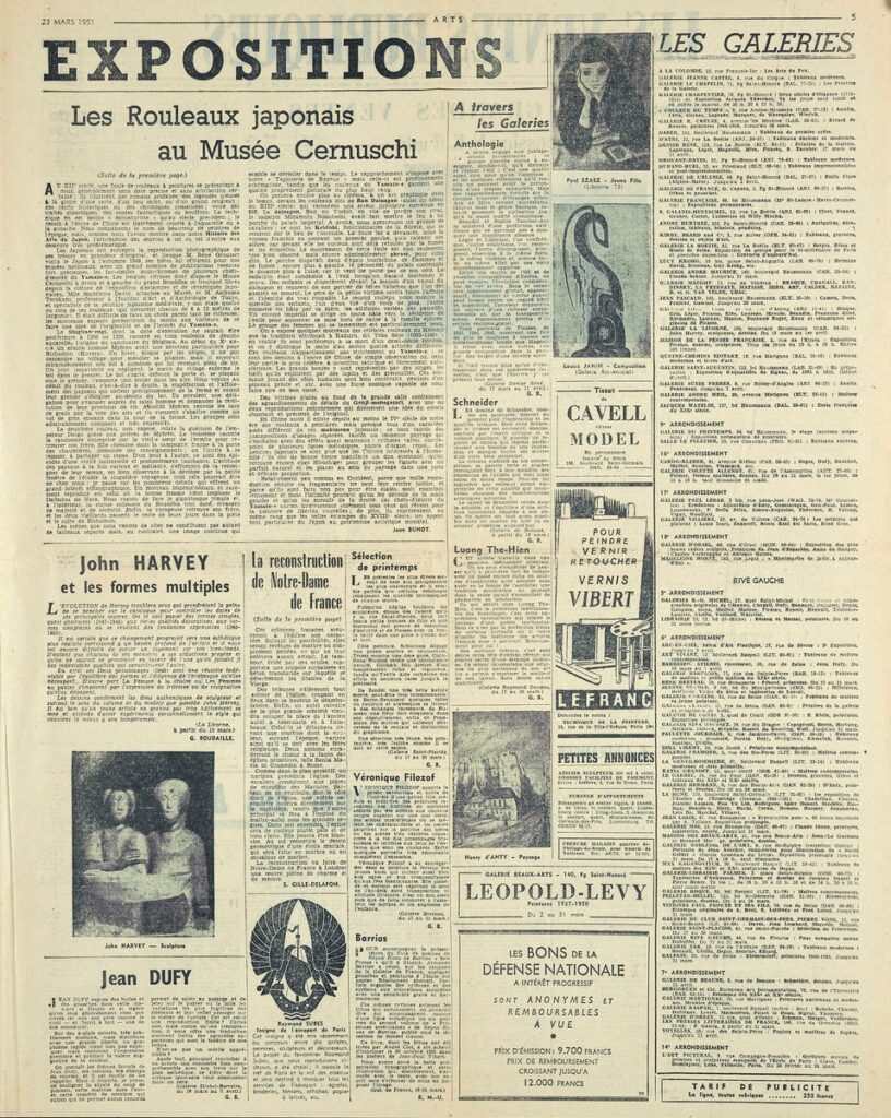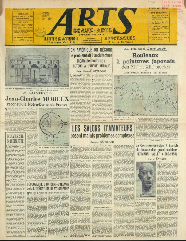 Έντυπο, στα γαλλικά, χαρτί, 4 φύλλα, 8 σελίδες, 56×43 εκ., όπου δημοσιεύονται άρθρα με τίτλους: “A Londres. Jean-Charles Moreux reconstruit Notre-Dame de France”, “Les Salons de amateurs posent maints problèmes complexes”, “Au Musée Cernuschi. Rouleaux à peintures japonais des XIIe et XIIIe siècles”, “La Commémoration à Zurich de le oeuvre de un grand sculpteur Hermann Haller (1880-1950)”. Το τεκμήριο εικονογραφείται.