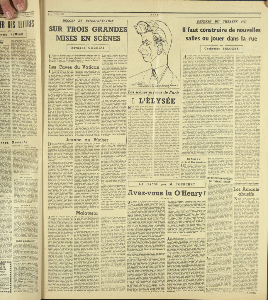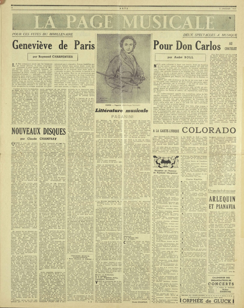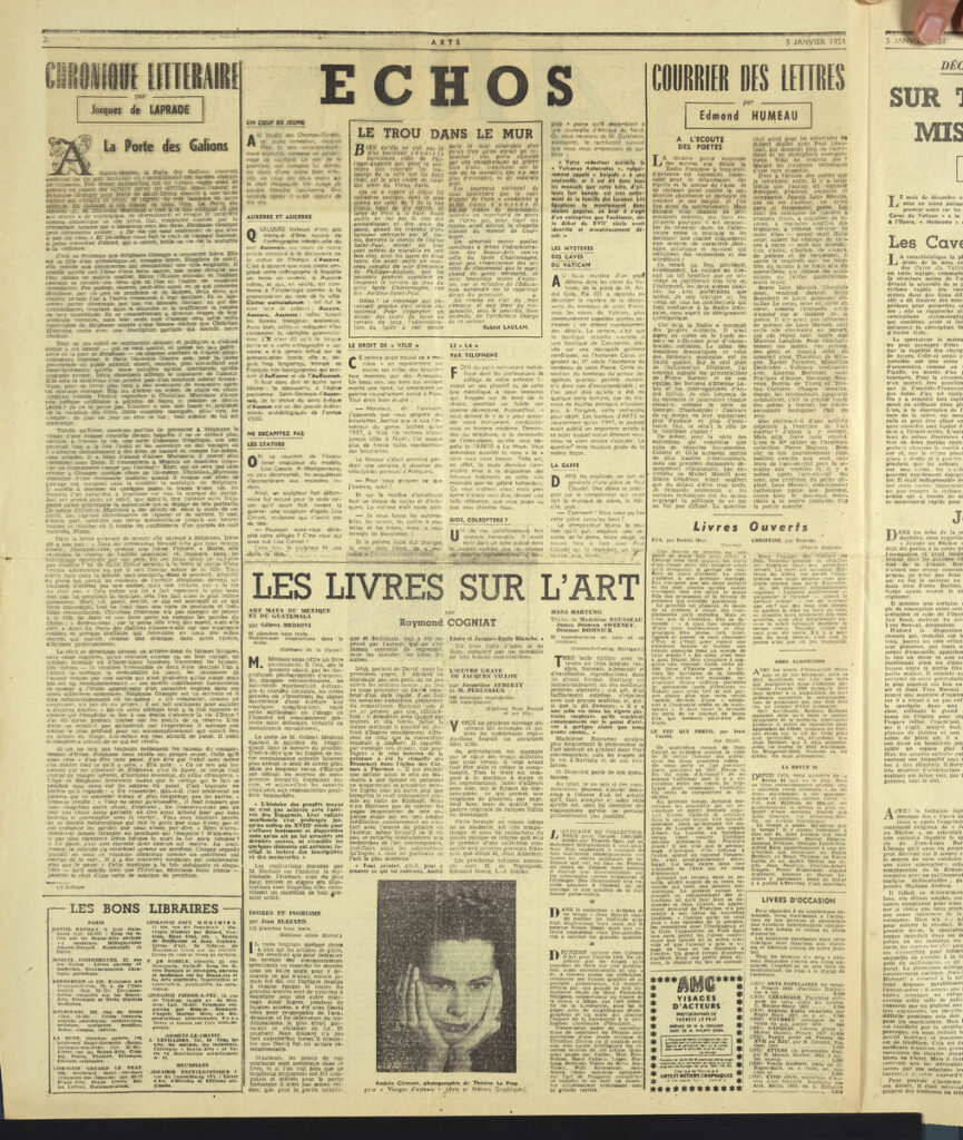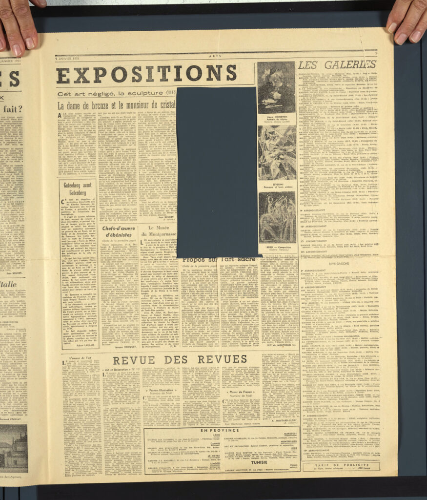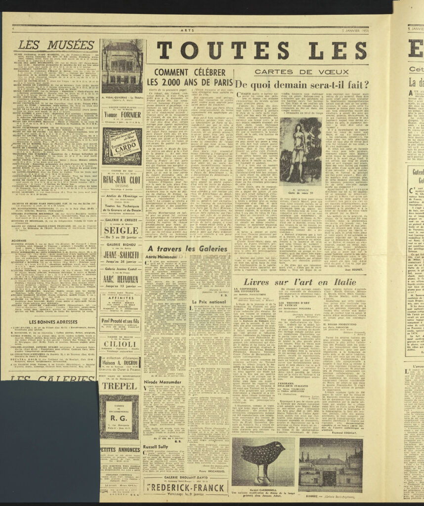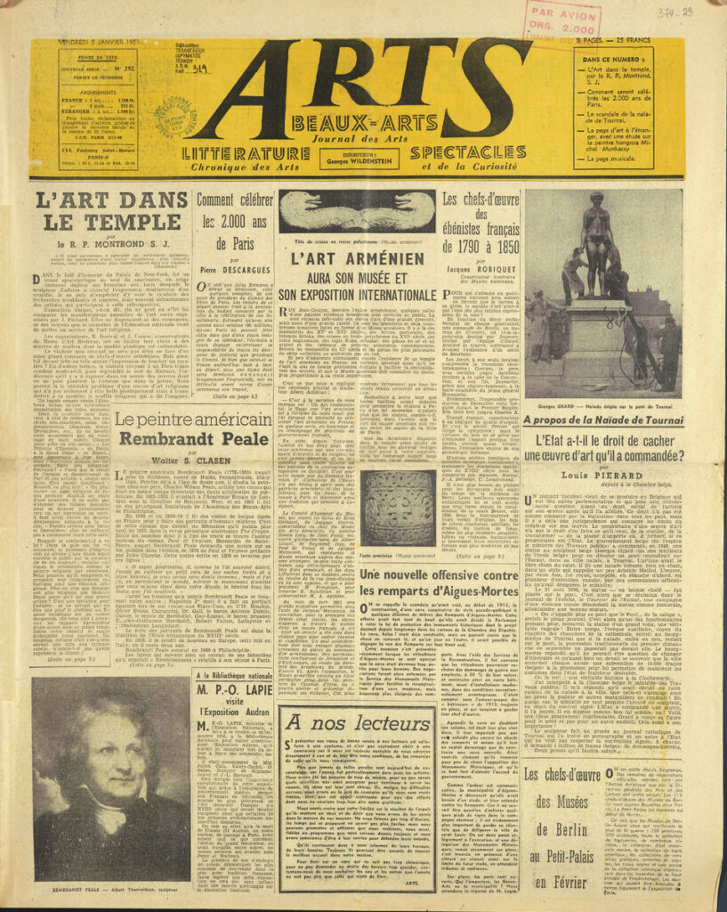 Έντυπο, στα γαλλικά, χαρτί, 4 φύλλα, 8 σελίδες, 56×43 εκ., όπου δημοσιεύονται άρθρα με τίτλους:”L Art dans le temple”, “Le peintre américain Rembrandt Peale”, “L art Arménien aura son Musée et son exposition internationale”, “Les chefs-d oeuvre des ébénistes français de 1790 à 1850”, “A propos de Naïde de Tournai. L Etat a-t-il le droit de cacher une oeuvre d art qu il a commandée?”, “Les chefs-d oeuvre des Musées de Berlin au Petit-Palais en Février”. Το τεκμήριο εικονογραφείται.