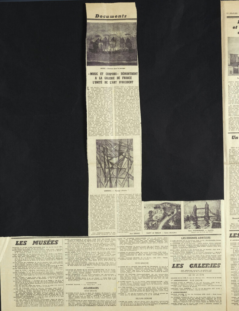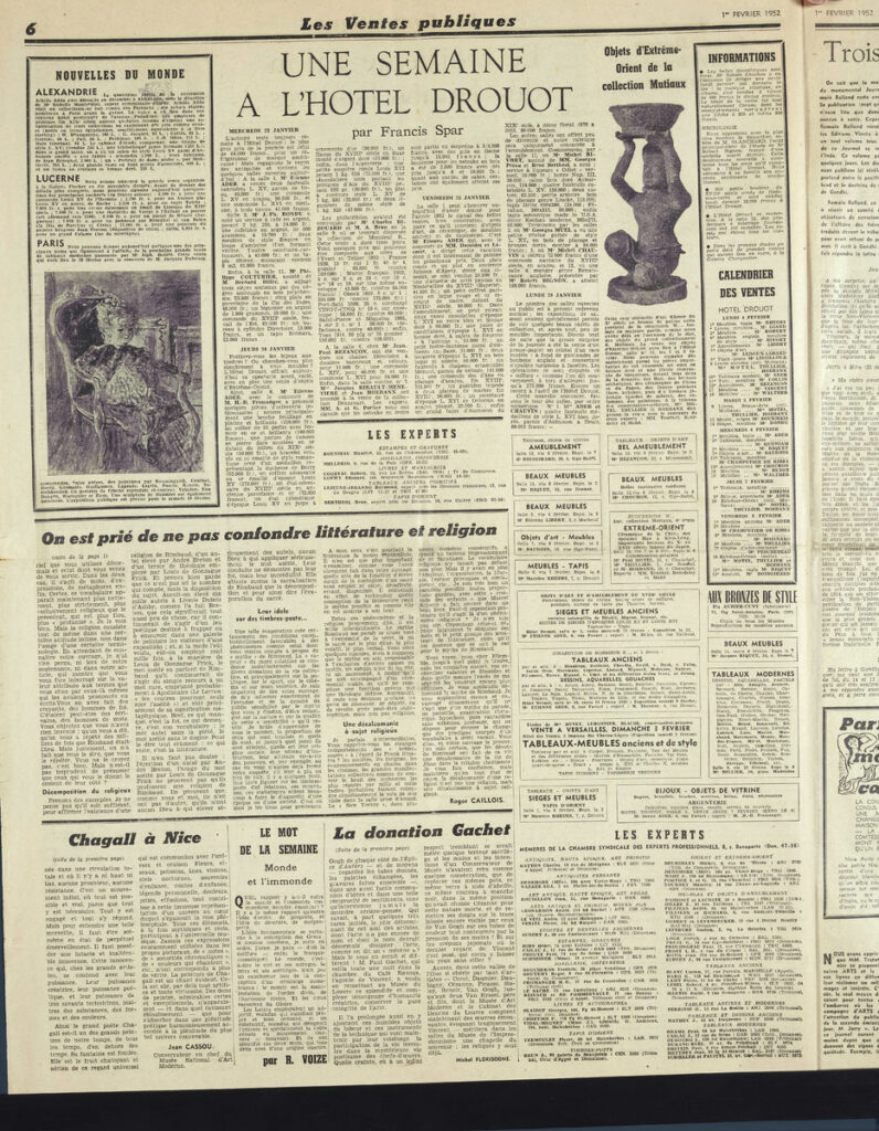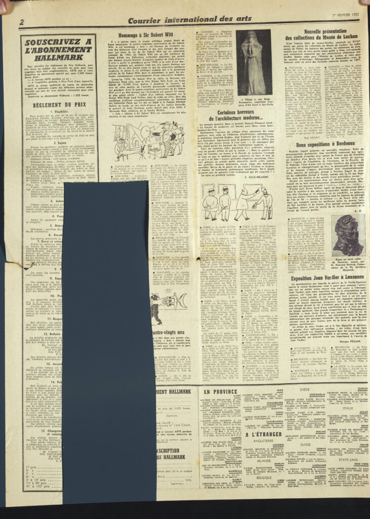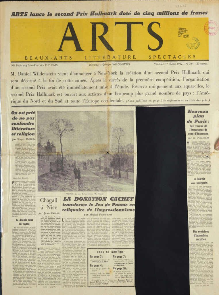 Έντυπο, στα γαλλικά, χαρτί, 4 φύλλα, 8 σελίδες, 56×43 εκ., όπου δημοσιεύονται άρθρα με τίτλους: “La Donation Gachet transform le Jeu de Paume en reliquaire de l impressionnisme”, “Nouveau plan de Paris: Des travaux de l importance de ceux d Hausmann”, “René Durey et l art français du paysage”, “Le troisième Salon des Jeunes Peintres”.