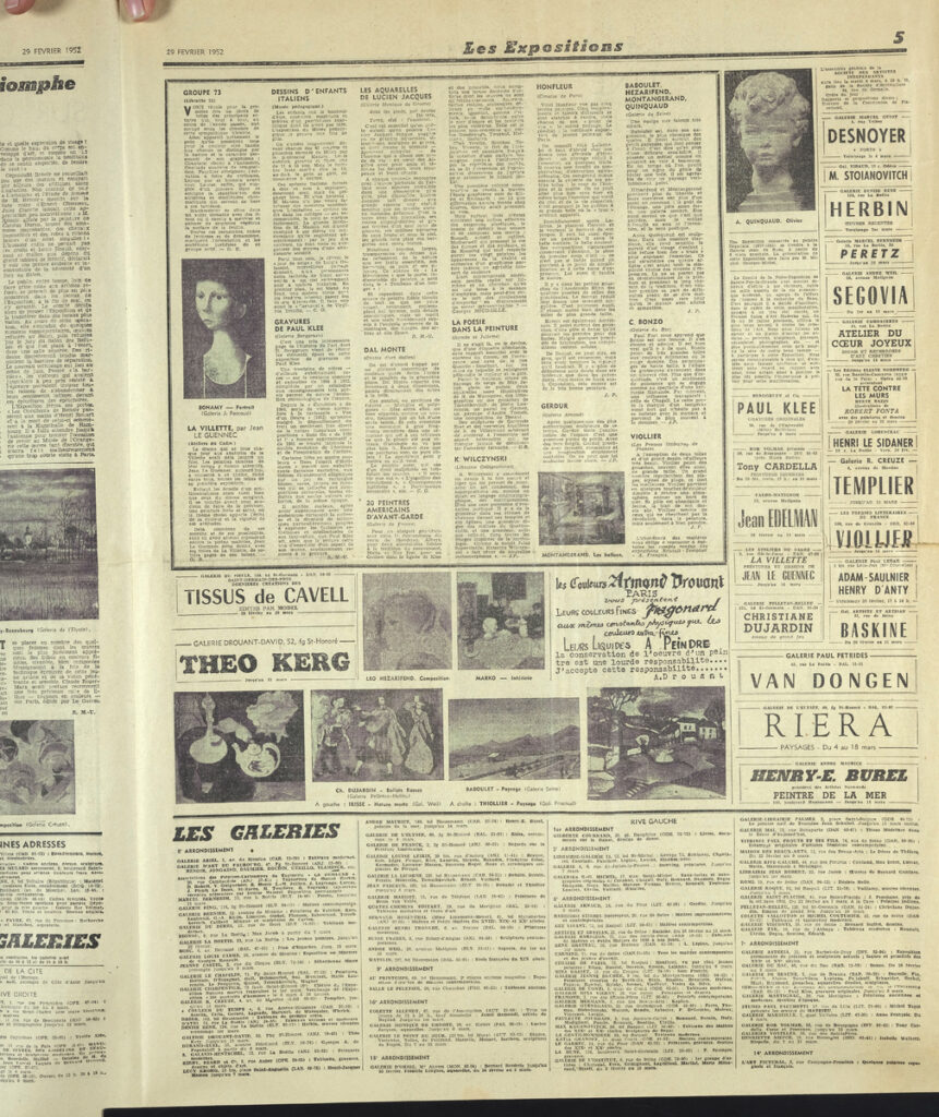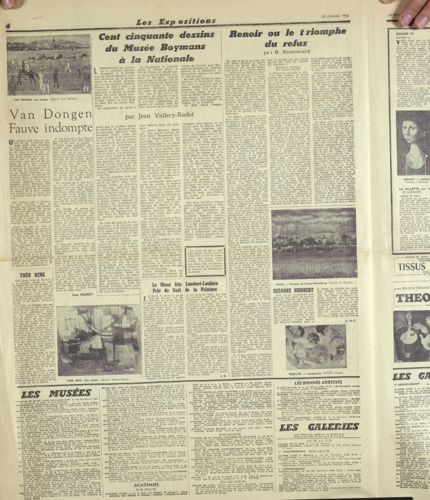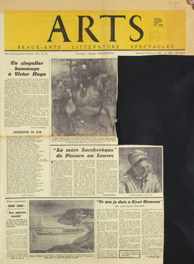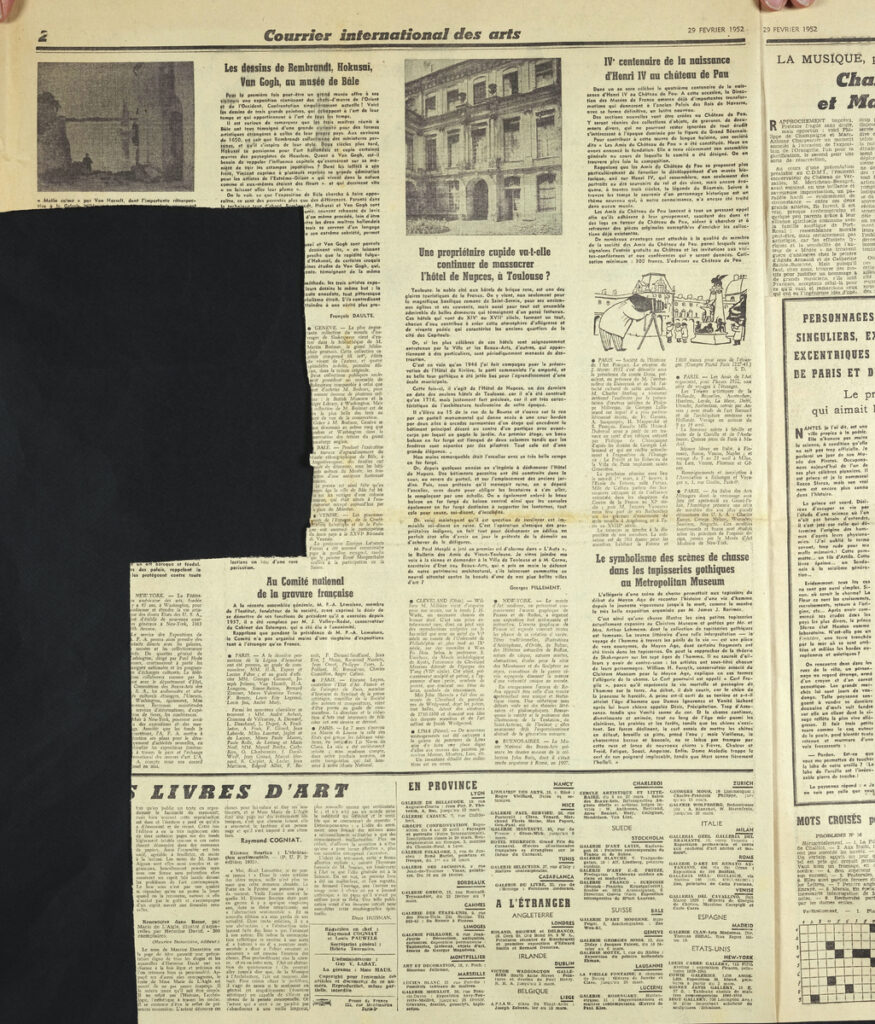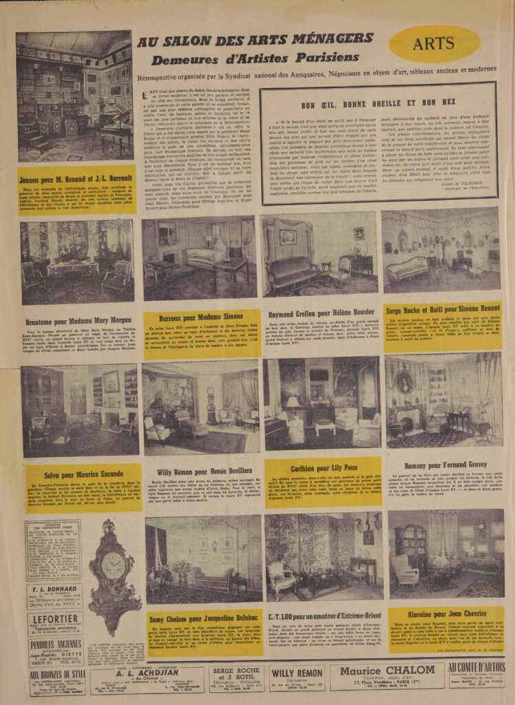 Έντυπο, στα γαλλικά, χαρτί, 5 φύλλα, 10 σελίδες, 56×43 εκ., όπου δημοσιεύονται άρθρα με τίτλους: “La mère Larchevêque” de Pissaro au Louvre”, “Cent cinquante dessin du Musée Boymans à la Nationale”, “Van Dongen. Fauve indompte”, “Renoir ou le triomphe du refus”. “Au Salon des Arts Mémagers. Demeures d Artistes Parisiens”. Το τεκμήριο εικονογραφείται.
