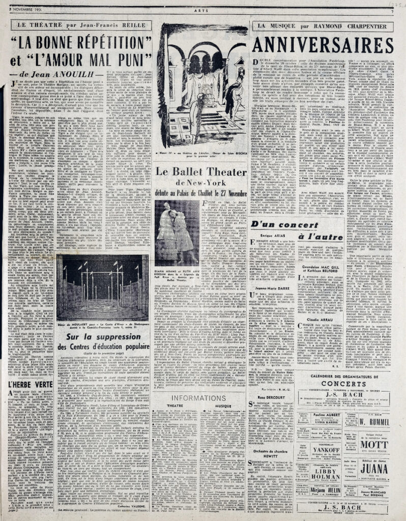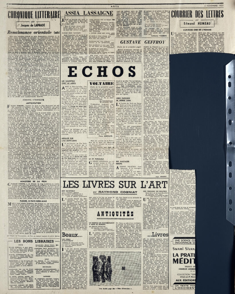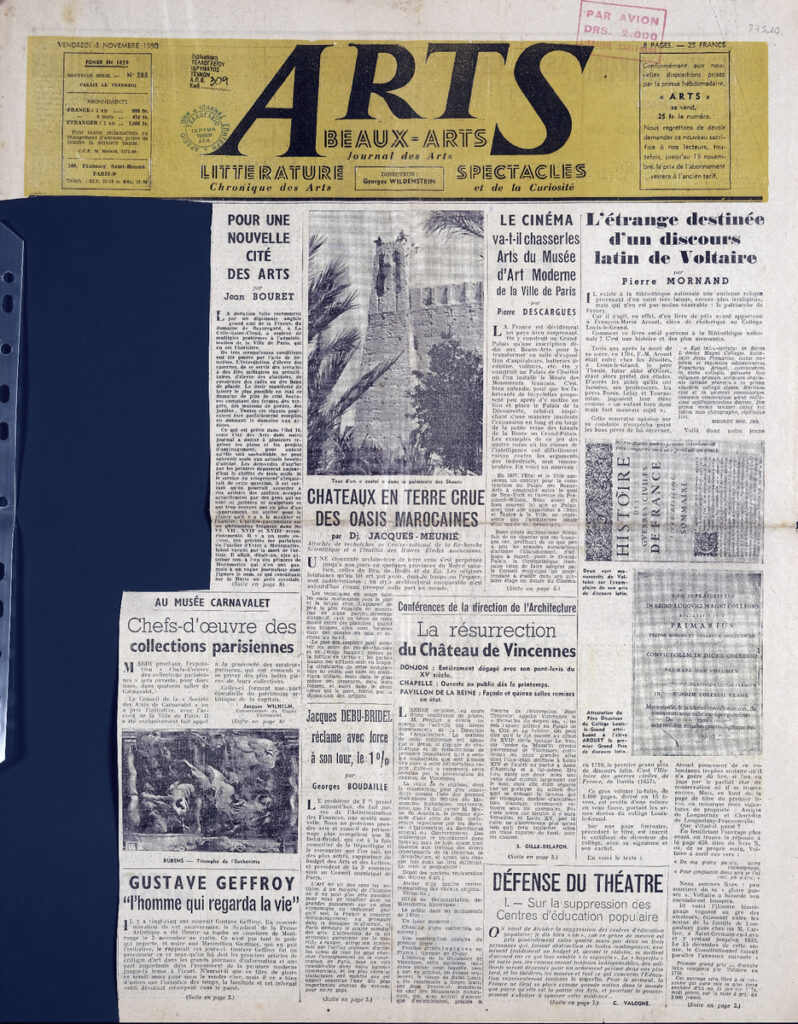Έντυπο, στα γαλλικά, χαρτί, 3 φύλλα, 6 σελίδες, 56×43 εκ., όπου δημοσιεύονται άρθρα με τίτλους: “Pour une nouvelle cité des arts”, “Chefs-d’ oeuvre des collections parisiennes”, “Images d’ Afrique”. Το τεκμήριο εικονογραφείται.