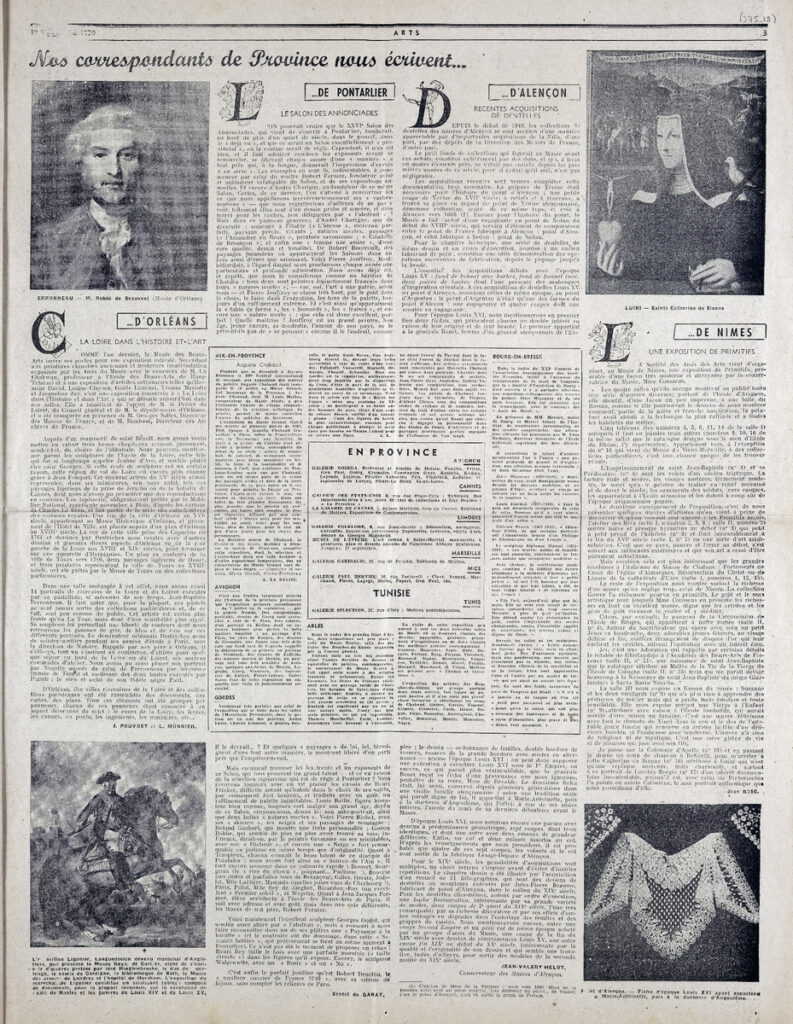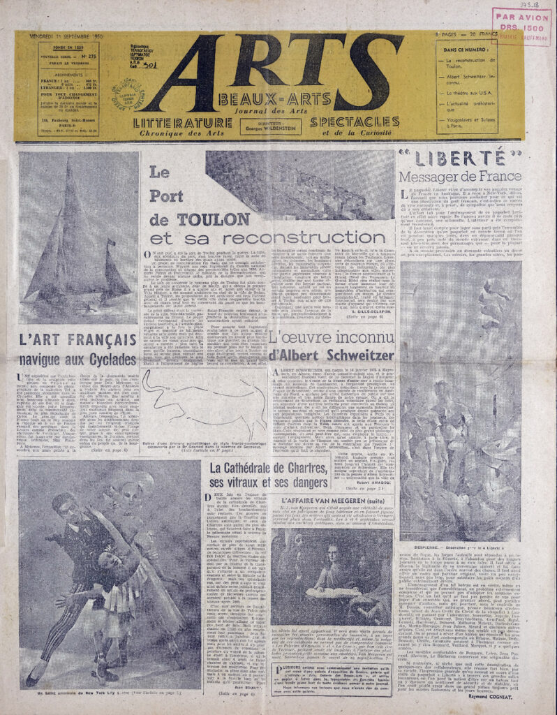 Έντυπο, στα γαλλικά, χαρτί, 2 φύλλα, 4 σελίδες, 56×43 εκ., όπου δημοσιεύονται άρθρα με τίτλους: “La Cathédrale de Chartres, ses vitraux et ses dangers”, “L’ oeuvre inconnu d’ Albert Schweitzer”, “Liberté’ Messager de France”, “Nos correspondants de Province nous écrivent”, “Les Galeries”, “Cartes postales”. Το τεκμήριο εικονογραφείται.