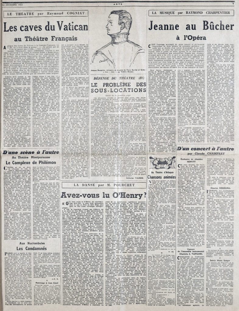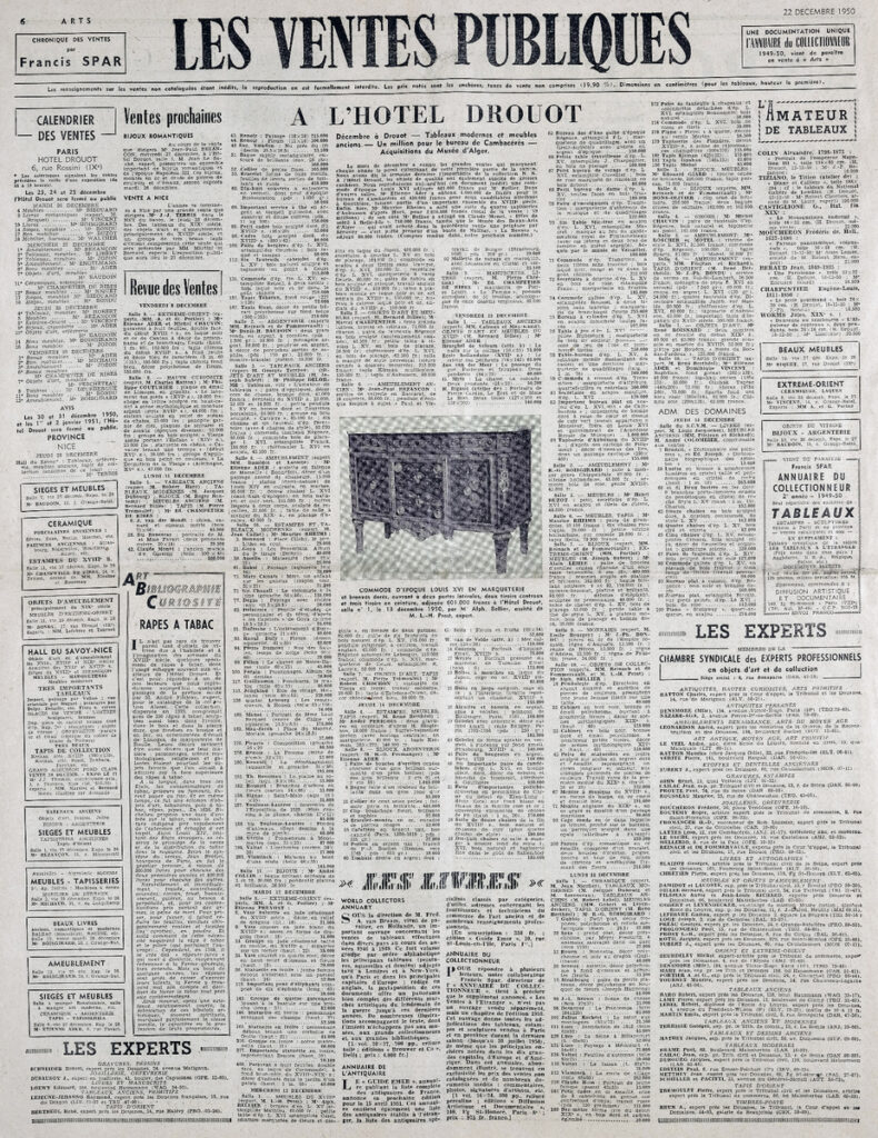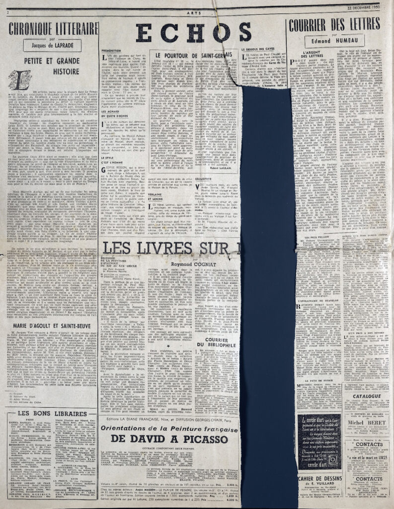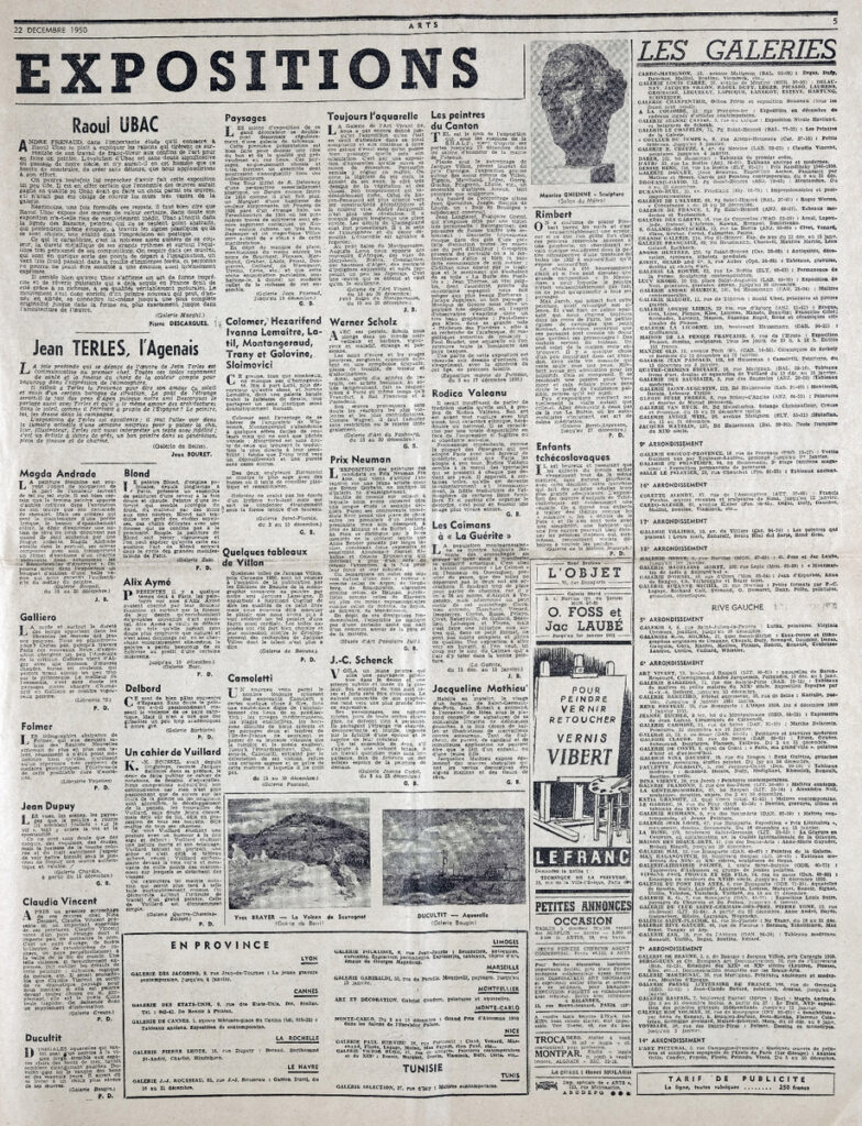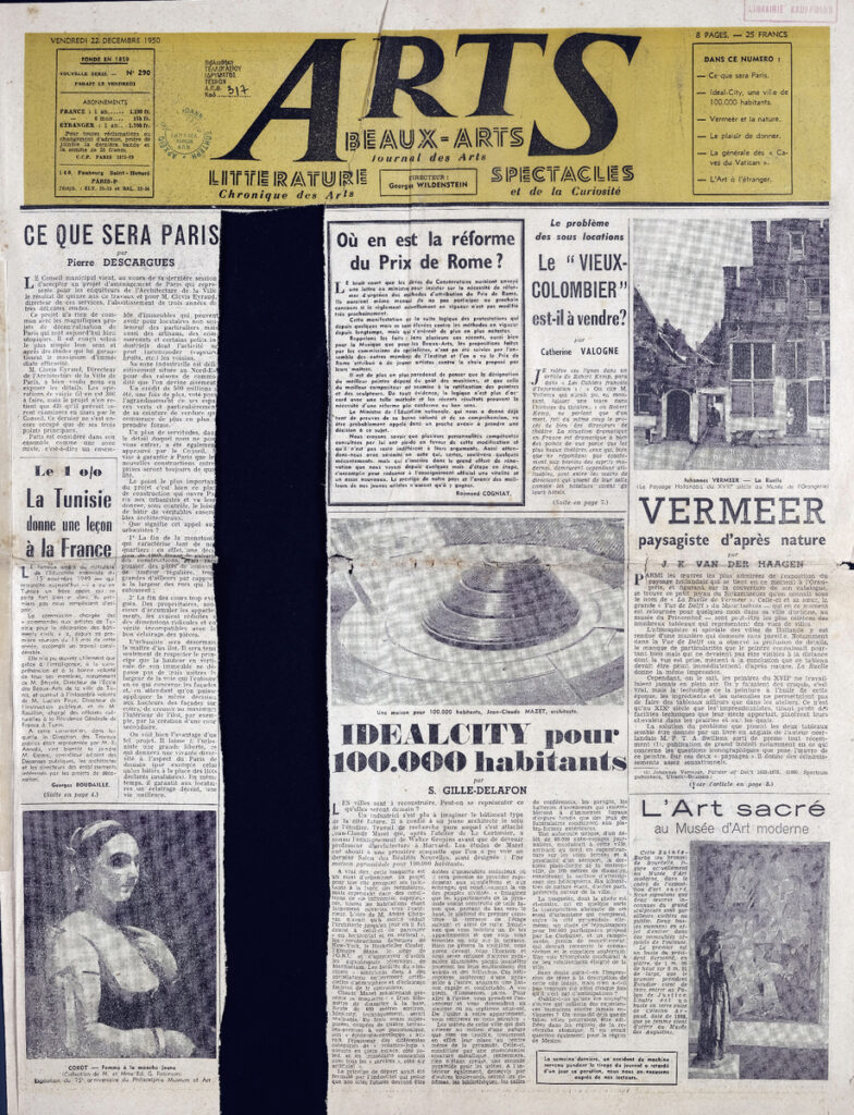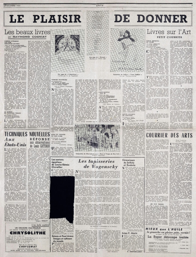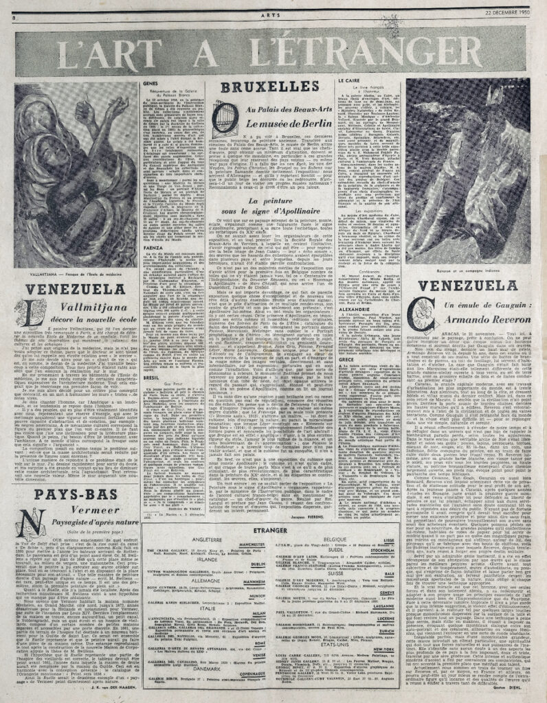 Έντυπο, στα γαλλικά, χαρτί, 4 φύλλα, 8 σελίδες, 56×43 εκ., όπου δημοσιεύονται άρθρα με τίτλους:”Toutes les expositions”, “L’ art à l’ étranger”, “Vermeer paysagiste d’ après nature”, “L’ art sacré au Musée d’ Art moderne”. Το τεκμήριο εικονογραφείται.