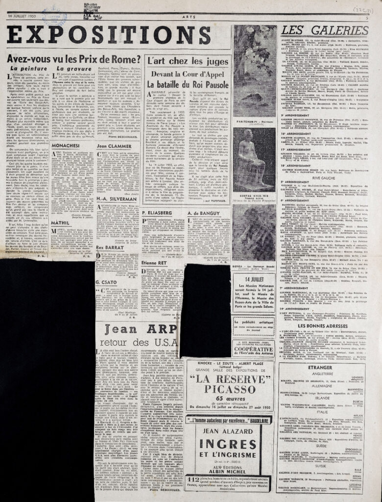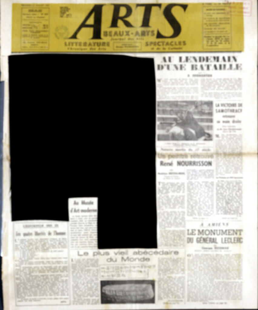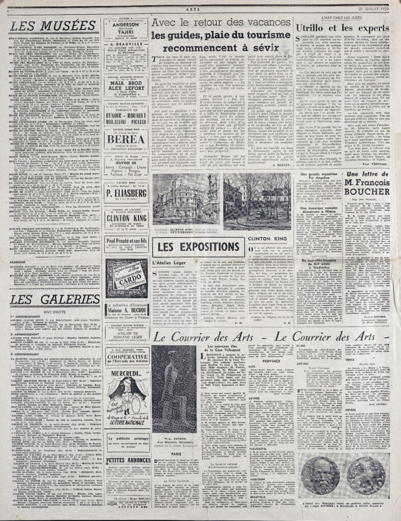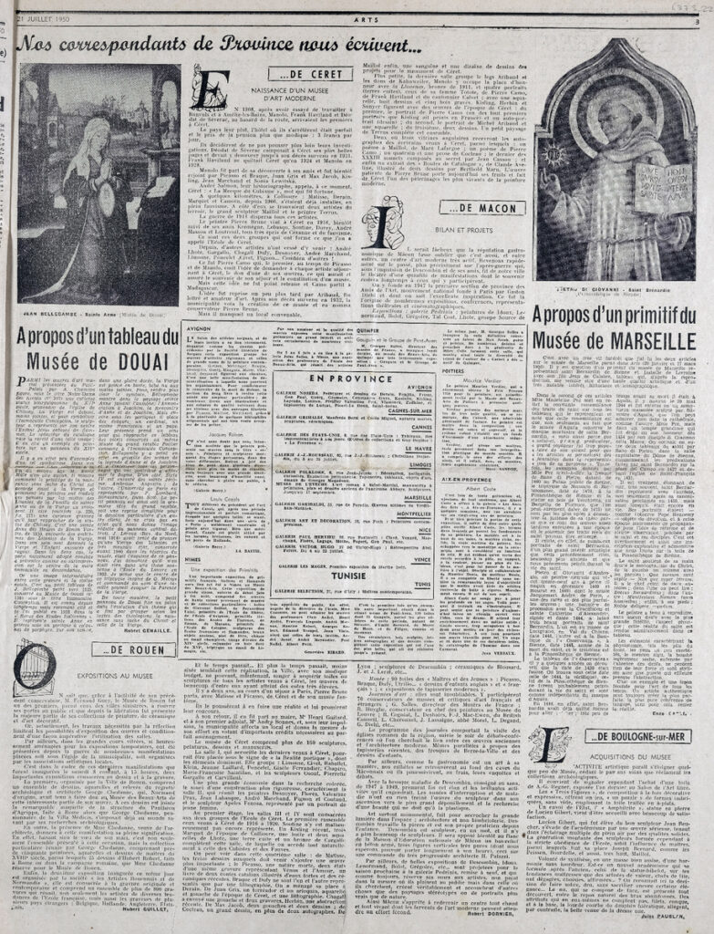 Έντυπο, στα γαλλικά, χαρτί, 3 φύλλα, 6 σελίδες, 56×43 εκ., όπου δημοσιεύονται άρθρα με τίτλους: “Un peintre retrouvé René Nourrisson”, “La Victoire de Samothrace retrouve sa main droite”, “Nos correspondants de Province nous écrivent”, “A propos d’ un primitif du Musée de Marseille”, “Utrillo et les experts”. Το τεκμήριο εικονογραφείται.
