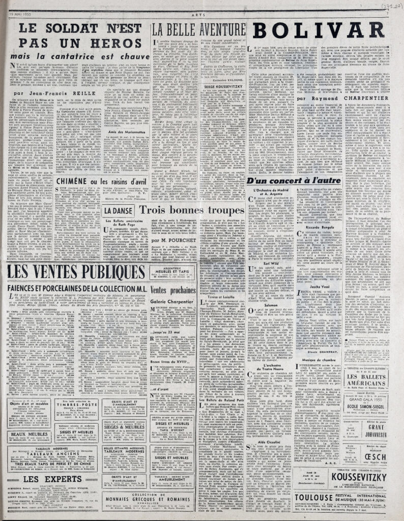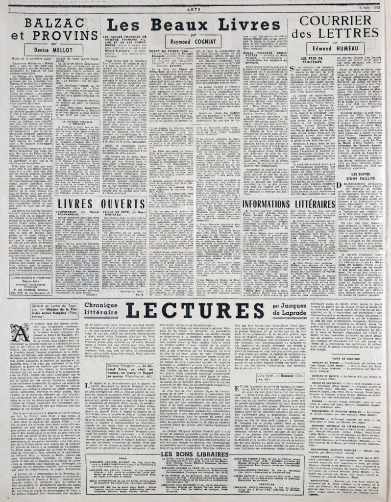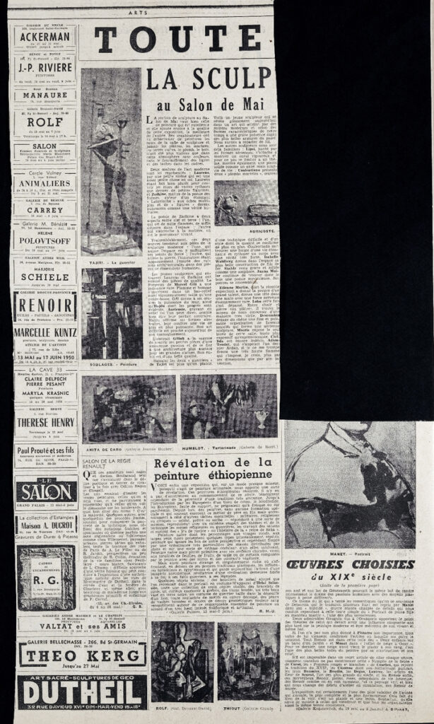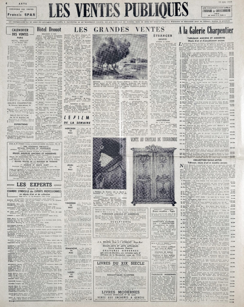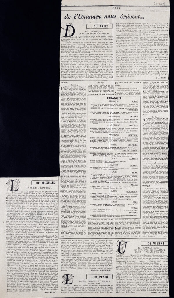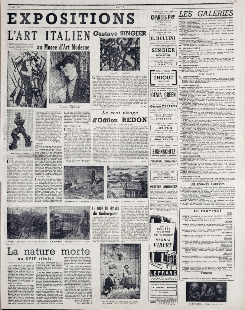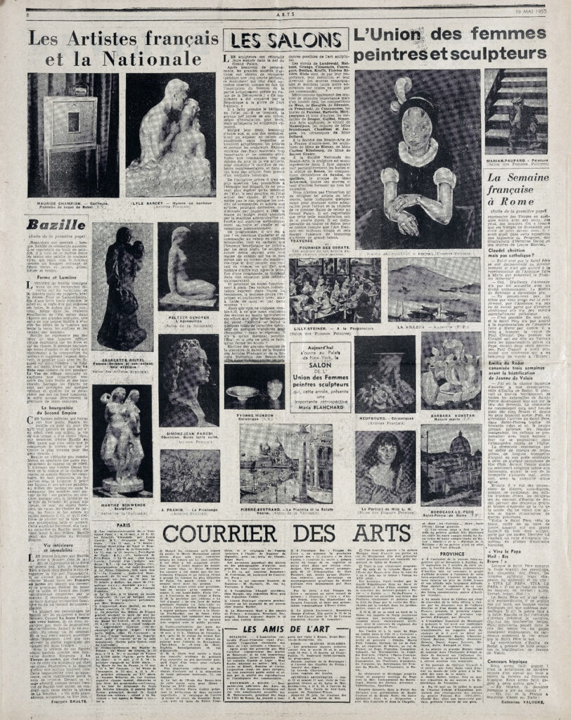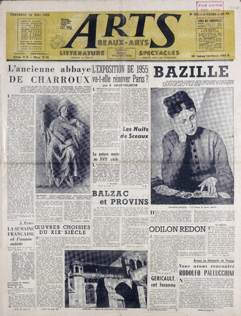 Έντυπο, στα γαλλικά, χαρτί, 3 φύλλα, 6 σελίδες, 56×43 εκ., όπου δημοσιεύονται άρθρα με τίτλους: “L’ ancienne abbaye de Charroux”, “L’ expositions de 1955 va-t-elle rénover Paris?”, “Bazille”, “Oeuvres choisies du XIXe s”, “L’ Union des femmes peintres et sculpteurs”, “Les Artistes français et la Nationale”, “Les Salons”. Το τεκμήριο εικονογραφείται.