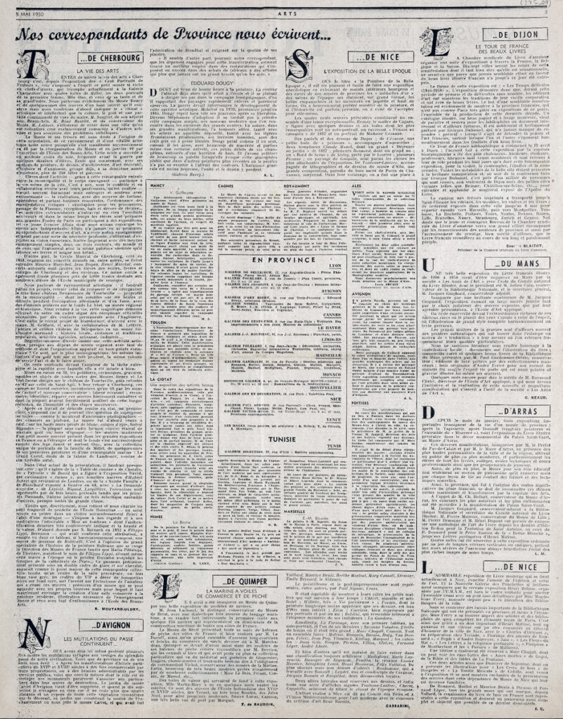 Έντυπο, στα γαλλικά, χαρτί, 3 φύλλα, 6 σελίδες, 56×43 εκ., όπου δημοσιεύονται άρθρα με τίτλους: “La beauté physique à l’ époque moderne”, “A propos de l’ affiche de Daumier”, “Nos correspondants de Province nous écrivent”, “Toutes les expositions”, “Madame Quinze”. Το τεκμήριο εικονογραφείται.
