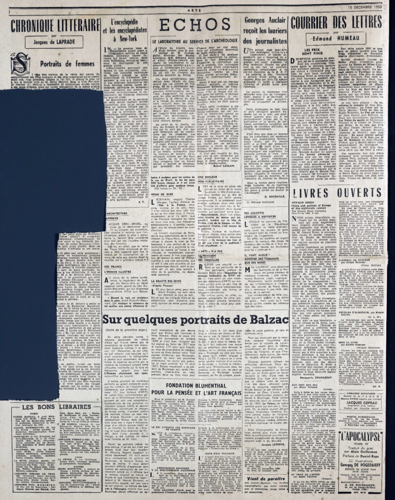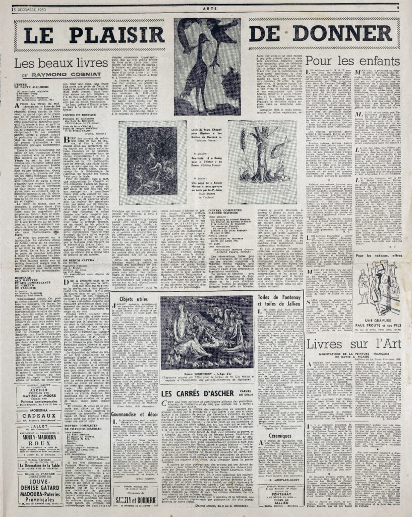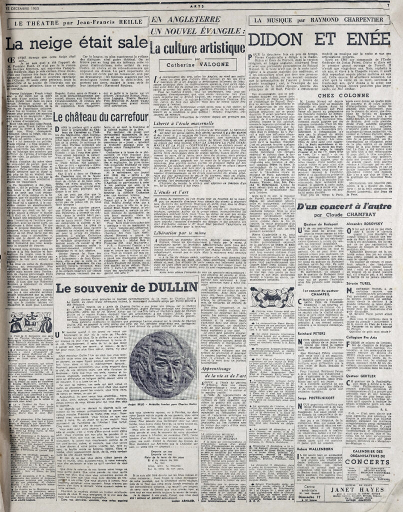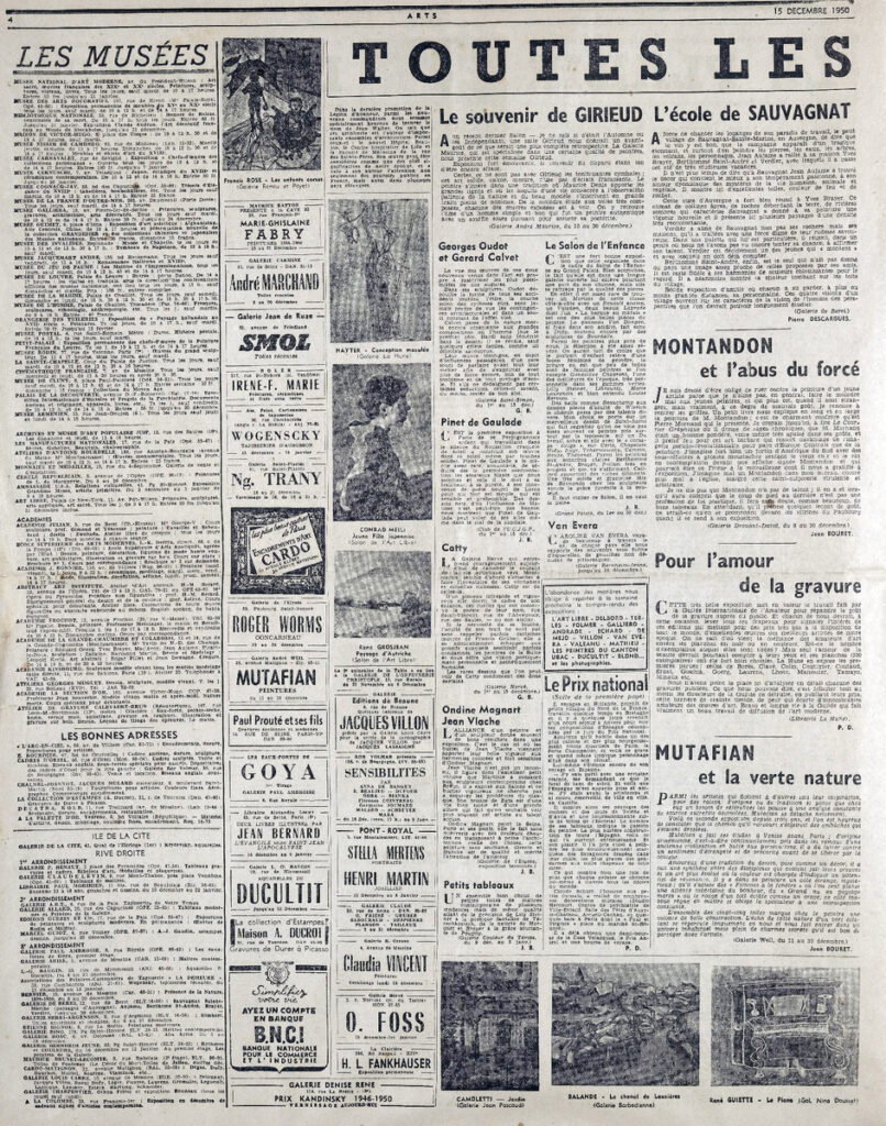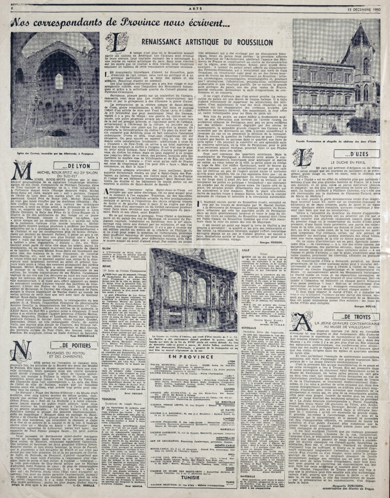 Έντυπο, στα γαλλικά, χαρτί, 5 φύλλα, 10 σελίδες, 56×43 εκ., όπου δημοσιεύονται άρθρα με τίτλους: “Les distributions des Prix”, “Toutes les expositions”, “La culture artistique”,”Le souvenir de Dullin”, “La renaissance artistique du Rouddillon”. Το τεκμήριο εικονογραφείται.