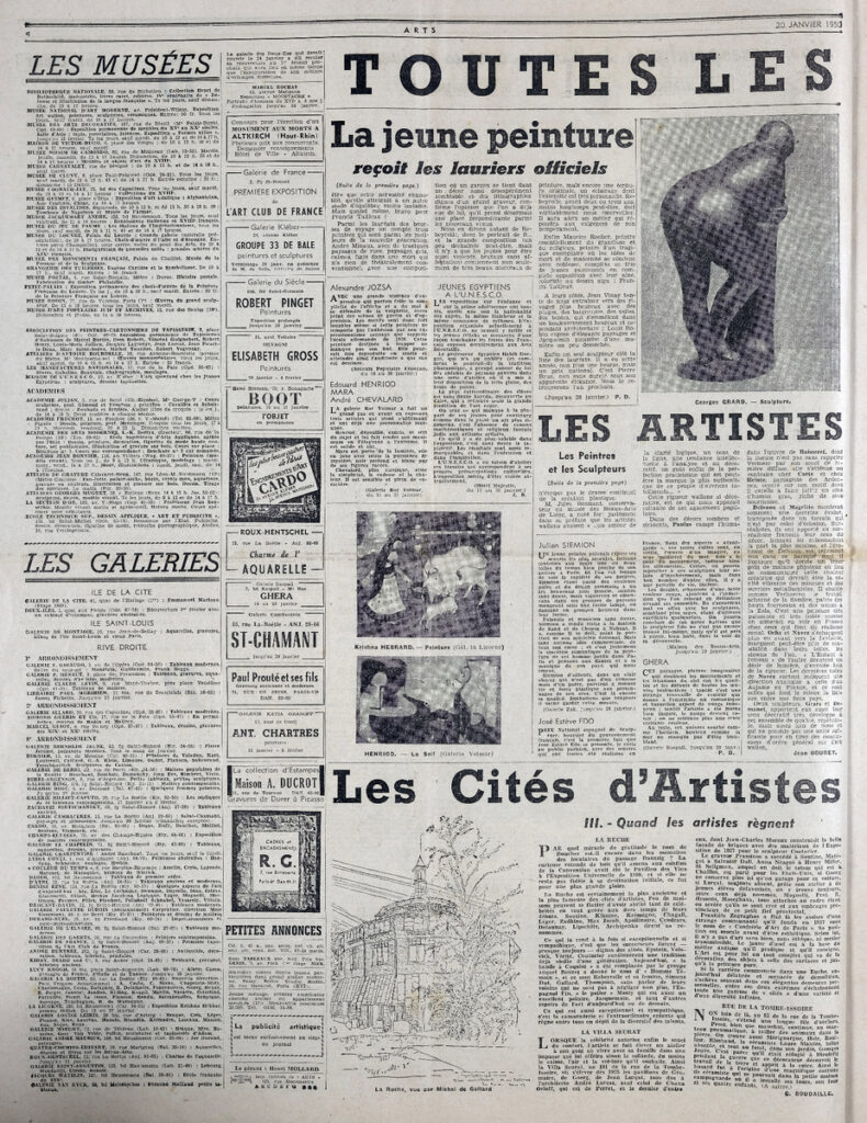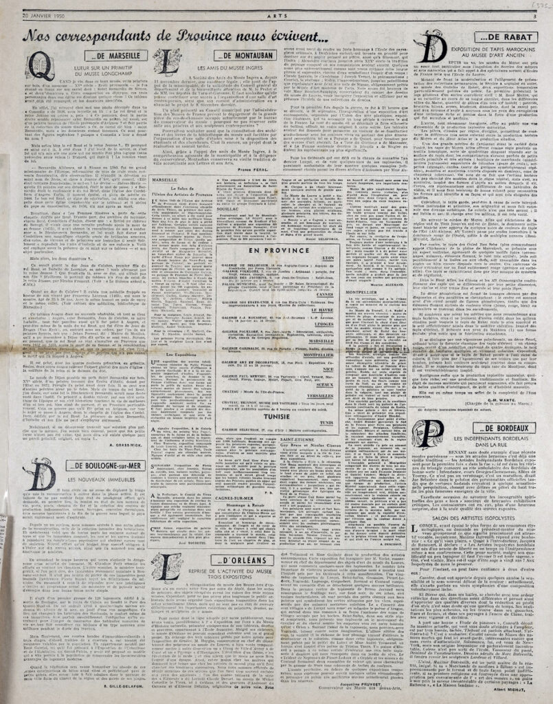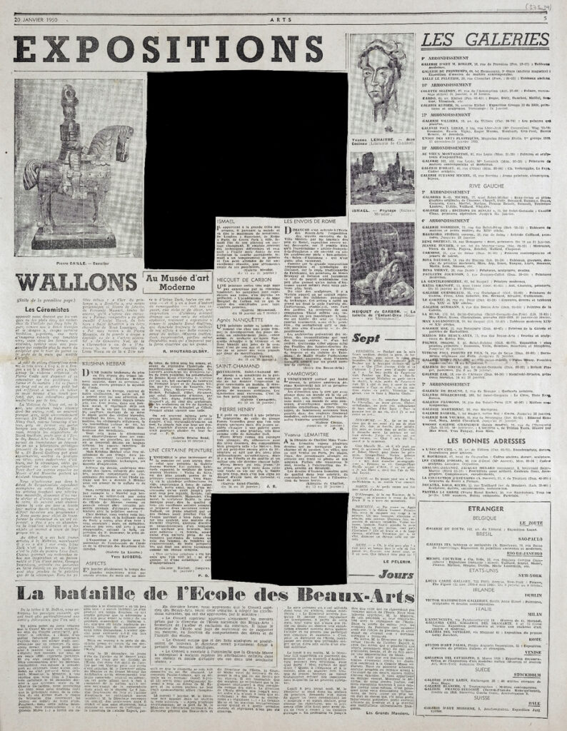 Έντυπο, στα γαλλικά, χαρτί, 4 φύλλα, 8 σελίδες, 56×43 εκ., όπου δημοσιεύονται άρθρα με τίτλους: “La jeune peinture reçoit les lauriers officiels”, “Nos correspondants de Province nous écrivent”, “Toutes les expositions”, “La bataille de l’ Ecole des Beaux-Arts”, “Inauguration au musée Saint-Pierre”.