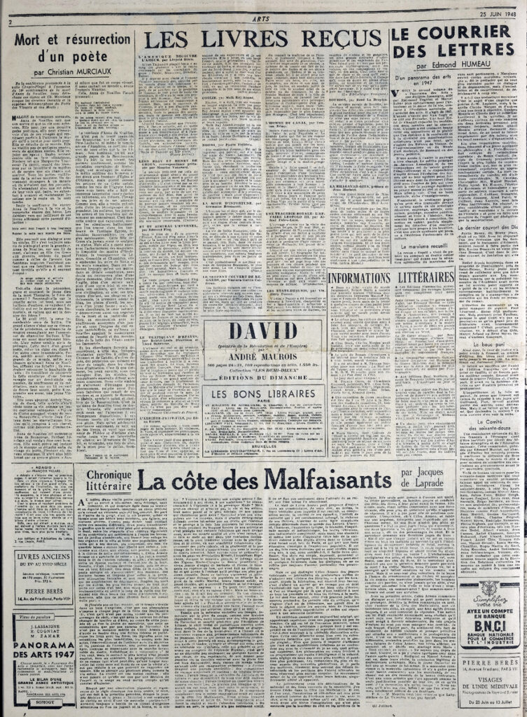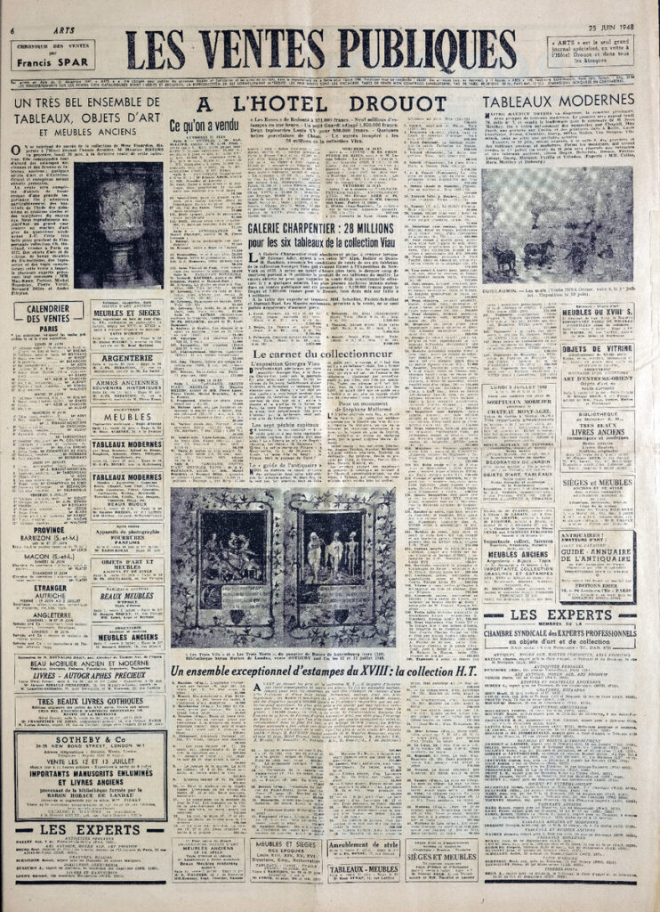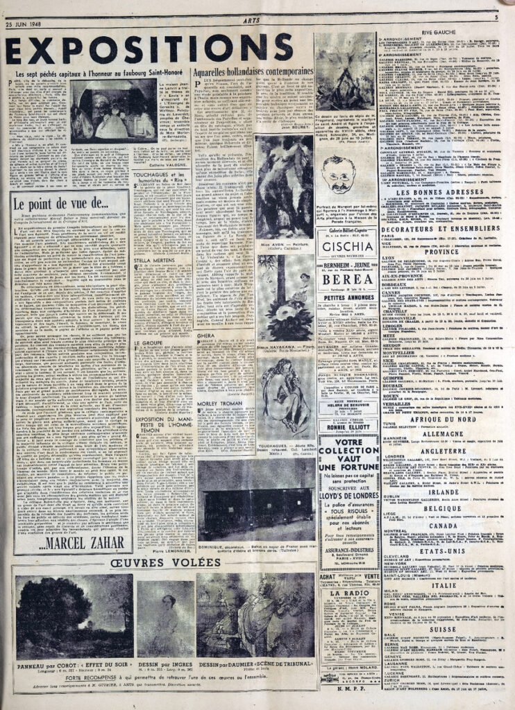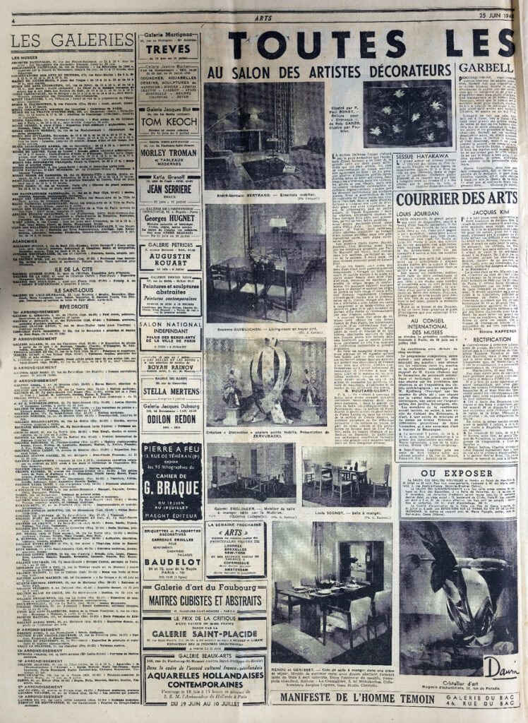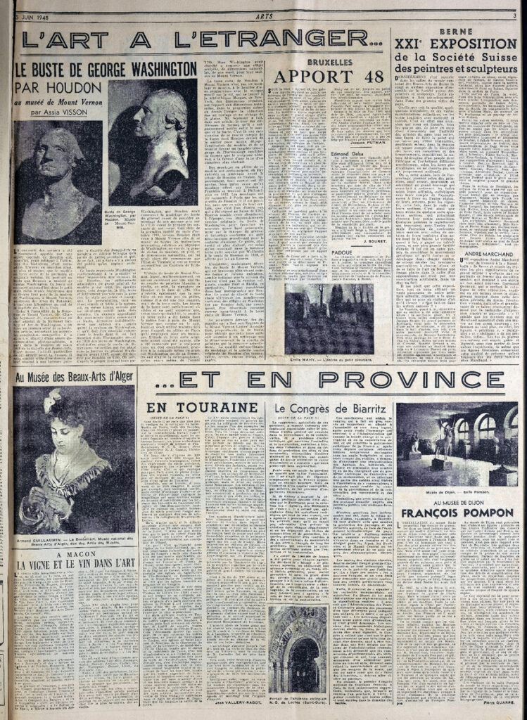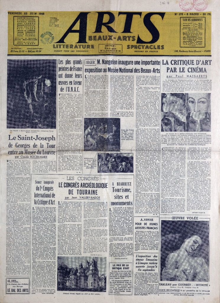 Έντυπο, στα γαλλικά, χαρτί, 3 φύλλα, 6 σελίδες, 60×43 εκ., όπου δημοσιεύονται άρθρα με τίτλους: Claude Roger-Marx “Le Saint-Joseph de Georges de la Tour entre au Musée du Louvre”, Jean Vallery-Radot “Le Congrès Archéologique de Touraine”, Léon Degand “Séance inaugurale du 1er Congrès de la Critique d Art”, H.P. “M. Naegelen inaugure une importante exposition au Musée Nationale des Beaux Arts”, Assia Visson “Le buste de George Washington par Houdon”, “XXIe exposition de la Société Suisse des peintes et sculpteurs”.