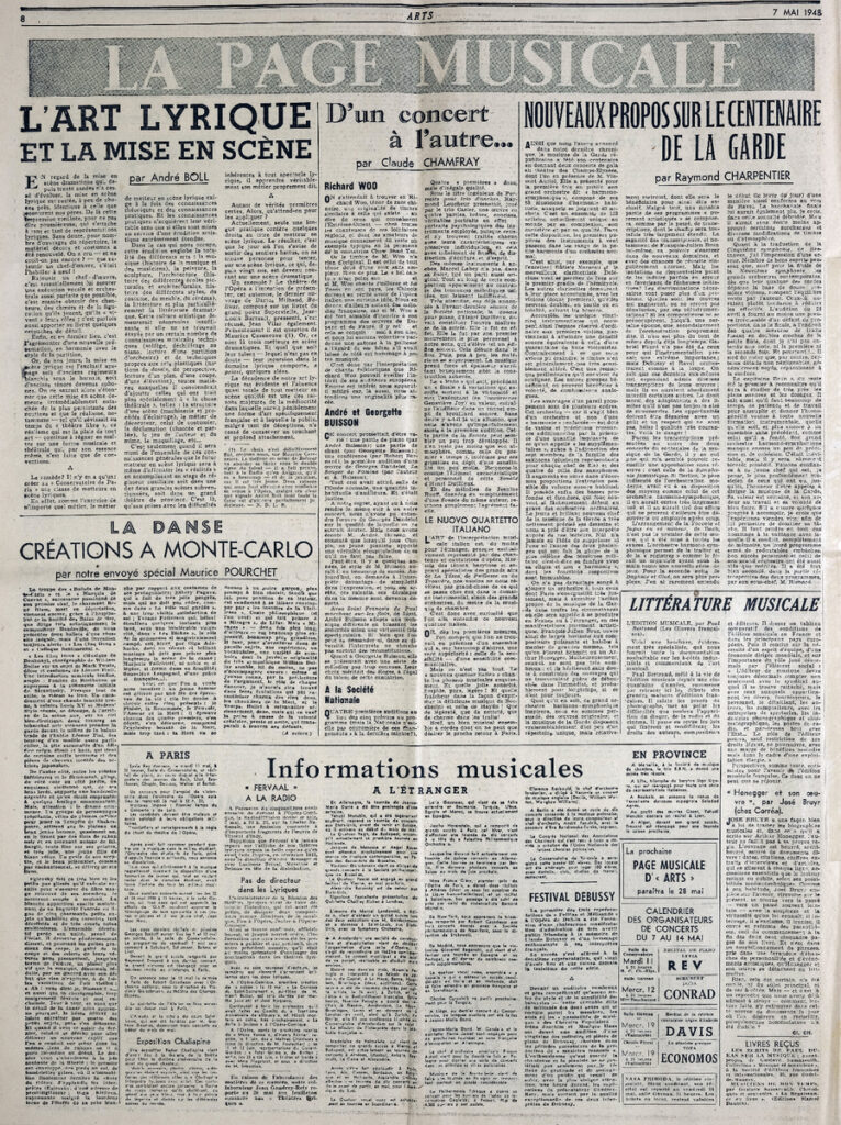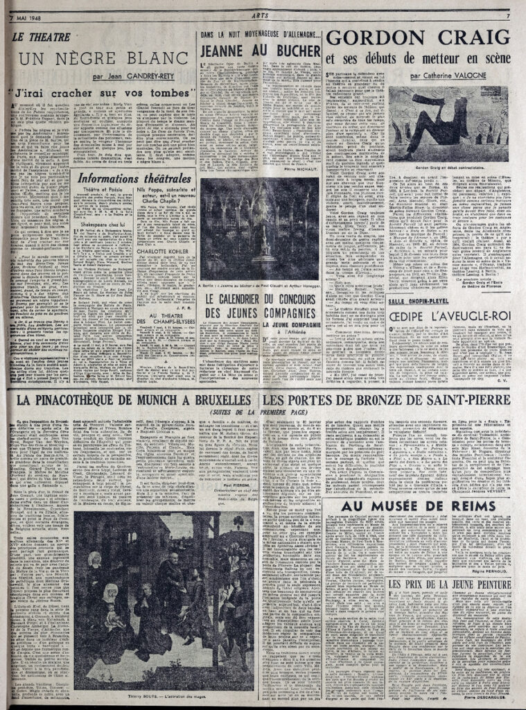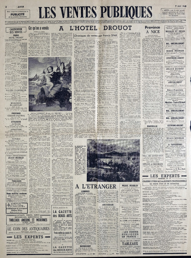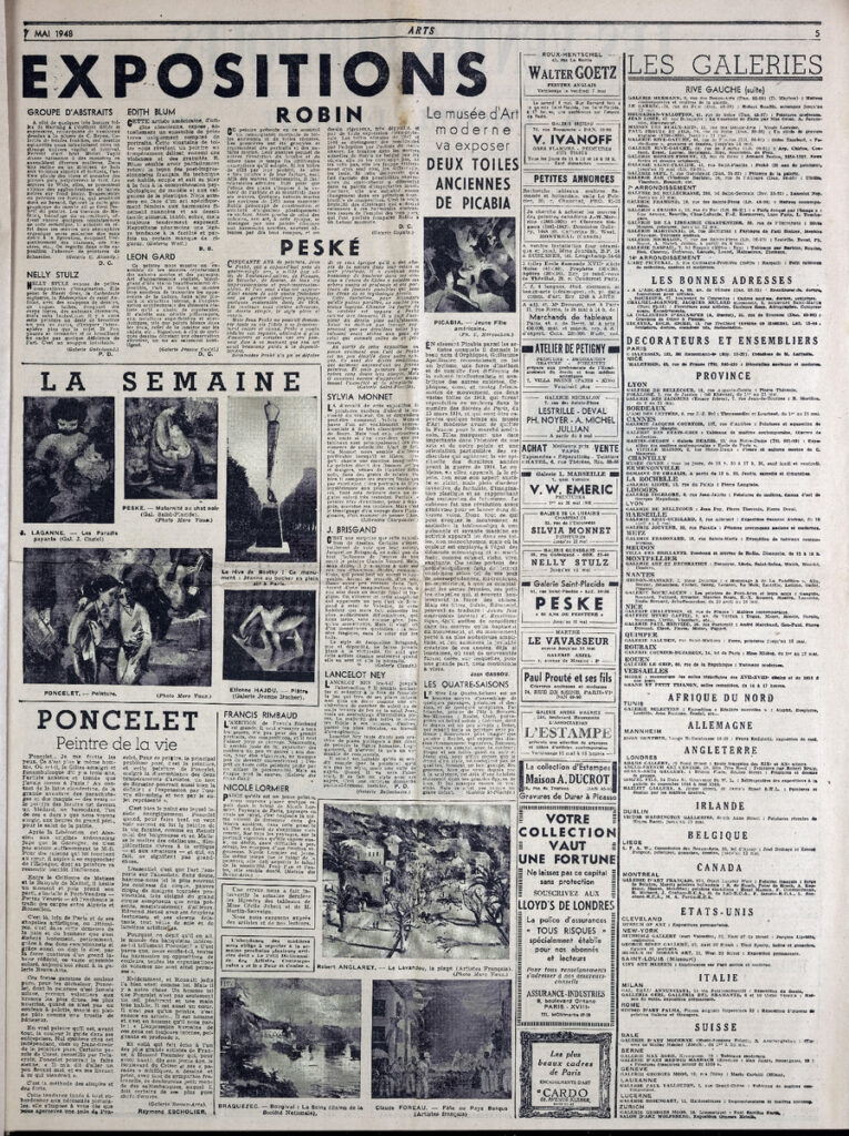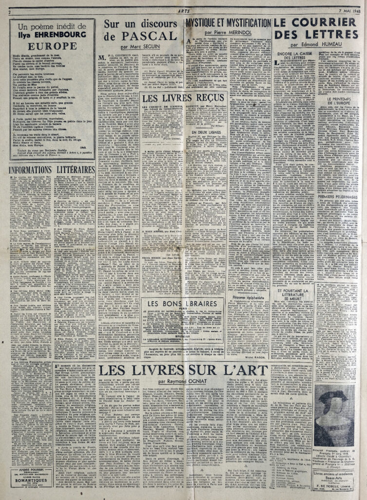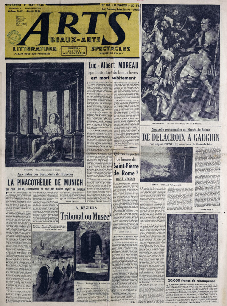 Έντυπο, στα γαλλικά, χαρτί, 3 φύλλα, 6 σελίδες, 60×43 εκ., όπου δημοσιεύονται άρθρα με τίτλους: Paul Fierens “La Pinacothèque de Munich. Aux Palais des Beaux-Arts de Bruxelles”, André Warnod “Luc-Albert Moreau”, Régine Pernoud “Nouvelle présentation au Musée de Reims de Delecroix a Gauguin”, Raymond Escholier “Poncelt. Peintre de la vie”.