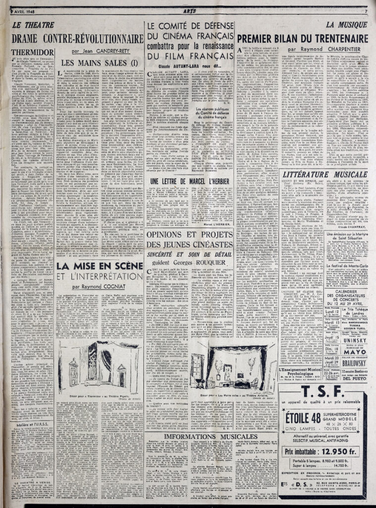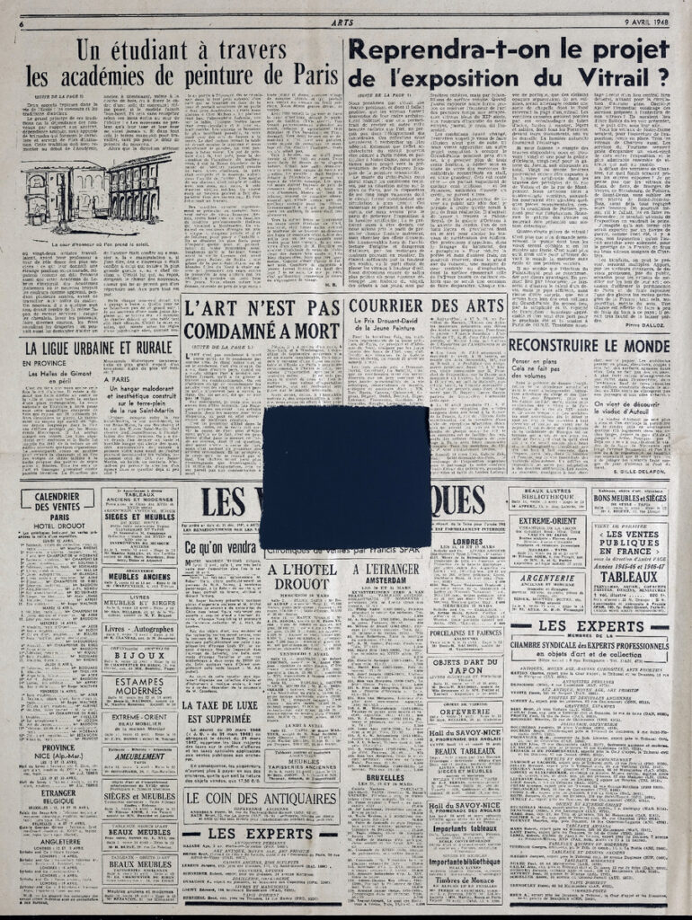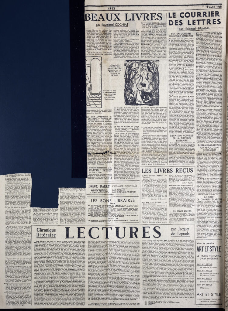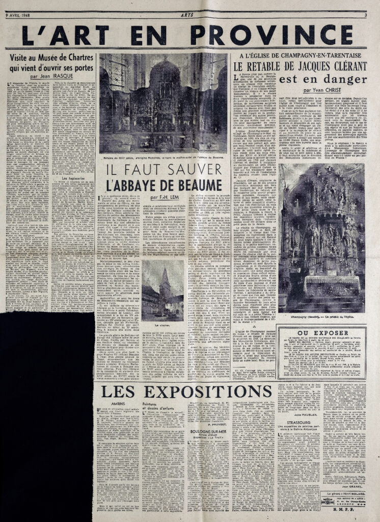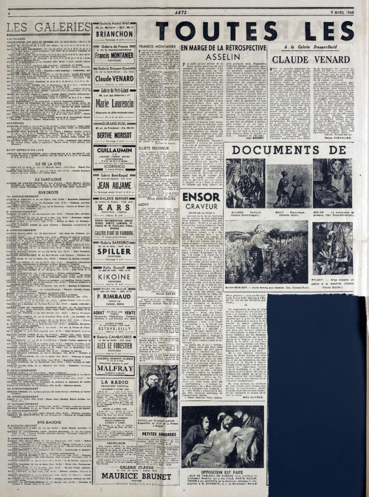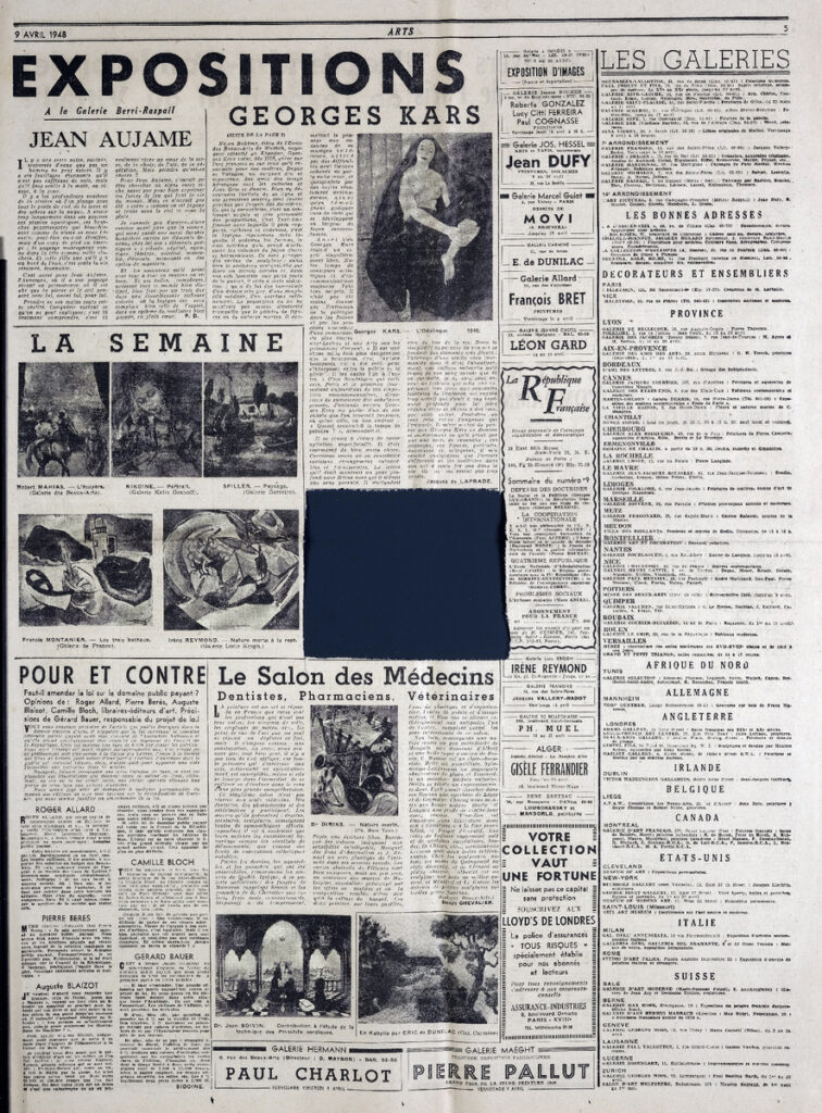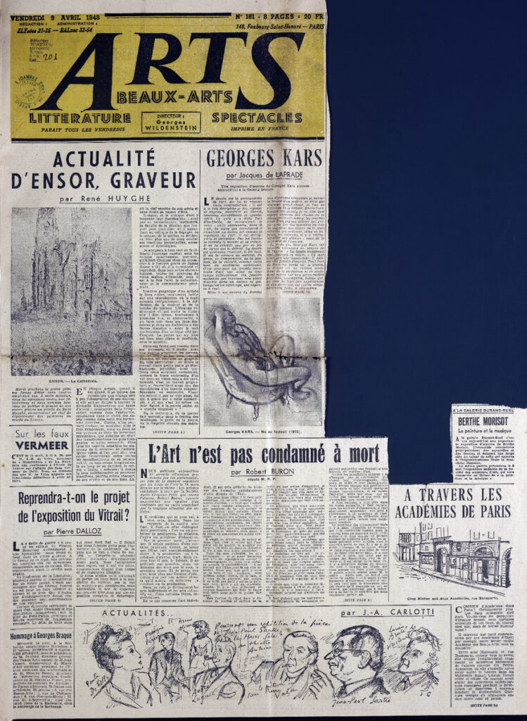 Έντυπο, στα γαλλικά, χαρτί, 4 φύλλα, 8 σελίδες, 60×43 εκ., όπου δημοσιεύονται άρθρα με τίτλους: René Huyghe “Actualité d Ensor, graveur”, Robert Buron “L art n est pas condamné à mort”, Jacques de Laprade “Georges Kars”, Jean Irasque “Visite au Musée de Chartres qui vient d ouvrir ses portes”, Margarita Nelken “La peinture mexicaine”, Georges Peillex “L art en Suisse”, Jacques Putman “L art en Belgique”.
