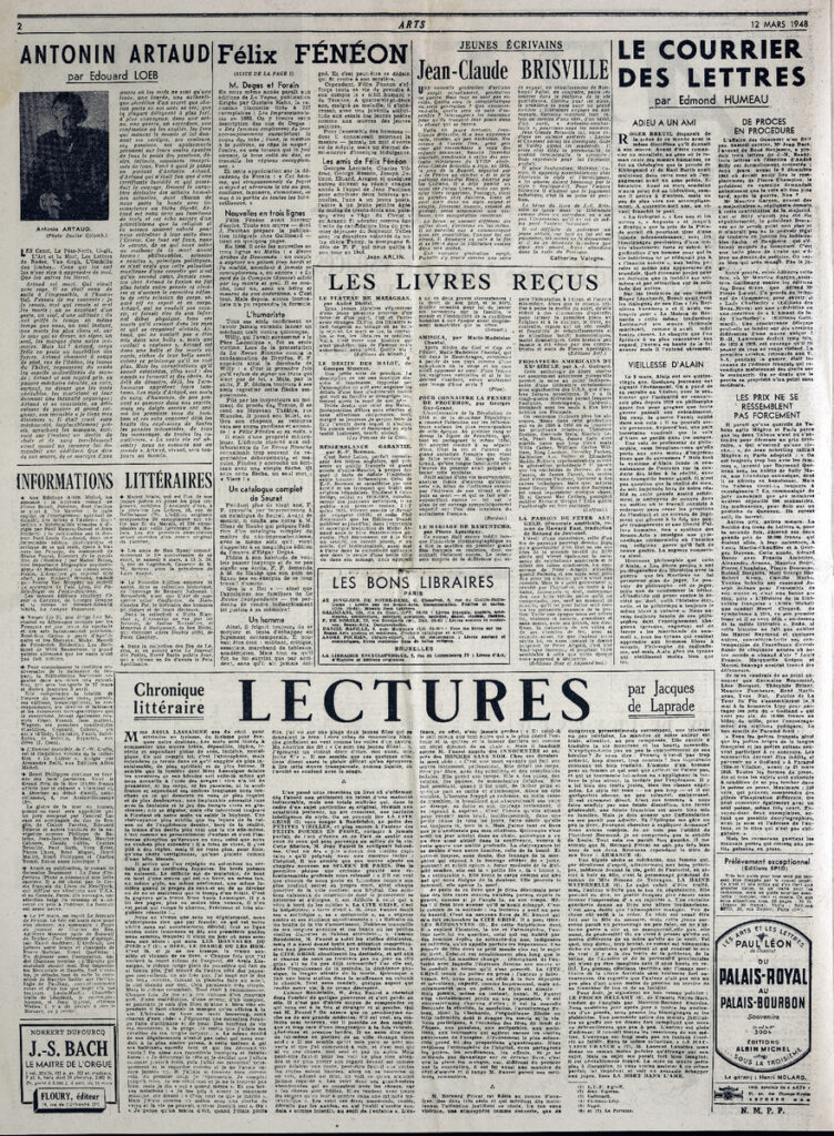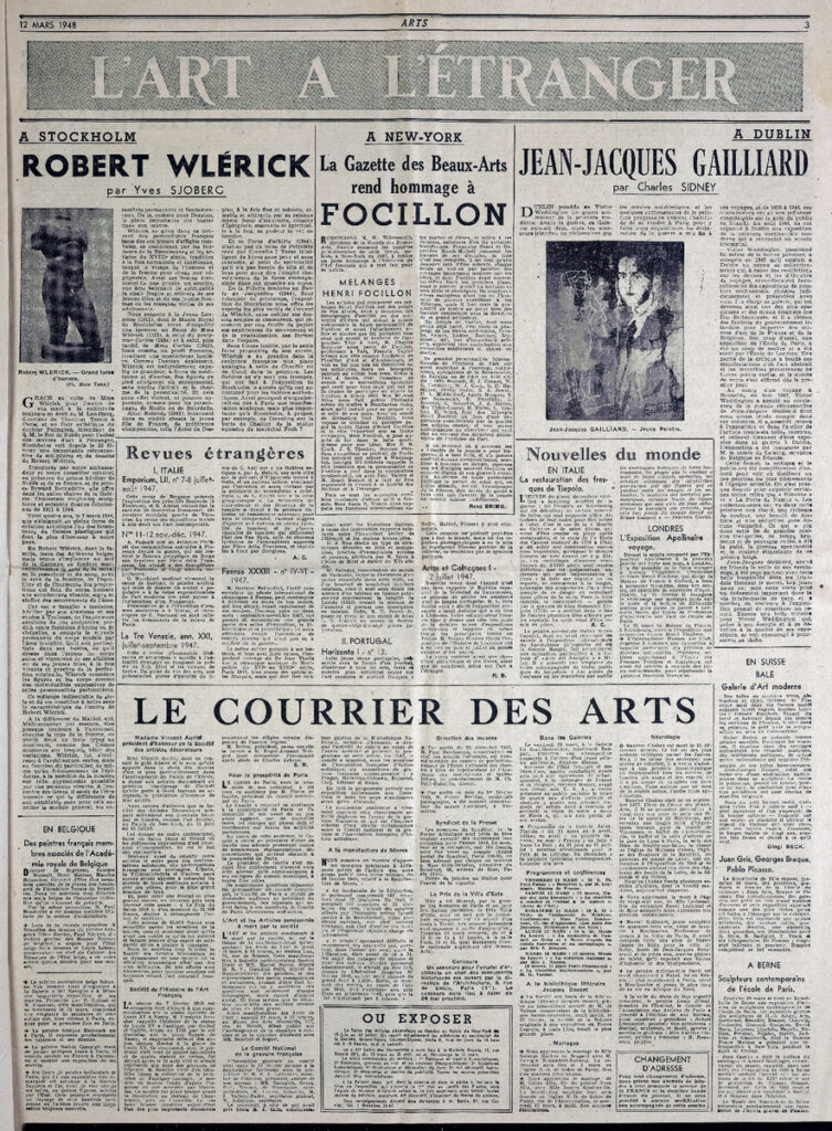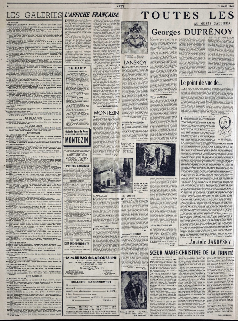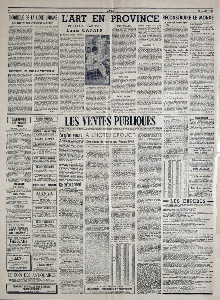 Έντυπο, στα γαλλικά, χαρτί, 3 φύλλα, 6 σελίδες, 60×43 εκ., όπου δημοσιεύονται άρθρα με τίτλους: P. Ladoue “Une belle carrière d Etienne Arago”, H. Heraut “Soeur Marie-Christine de la Trinité sera-t-elle autorisée à peindre?”, Yves Sjoberg “A Stockholm. Robert Wlérick”, Ch. Sidney “Jean-Jacques Gailliard”, “Georges Sufrénoy au Musée Galliera”, P. Descargues “Louis Vivin et trois siècles de peinture naive”, J. Catel “Louis Cazals”.