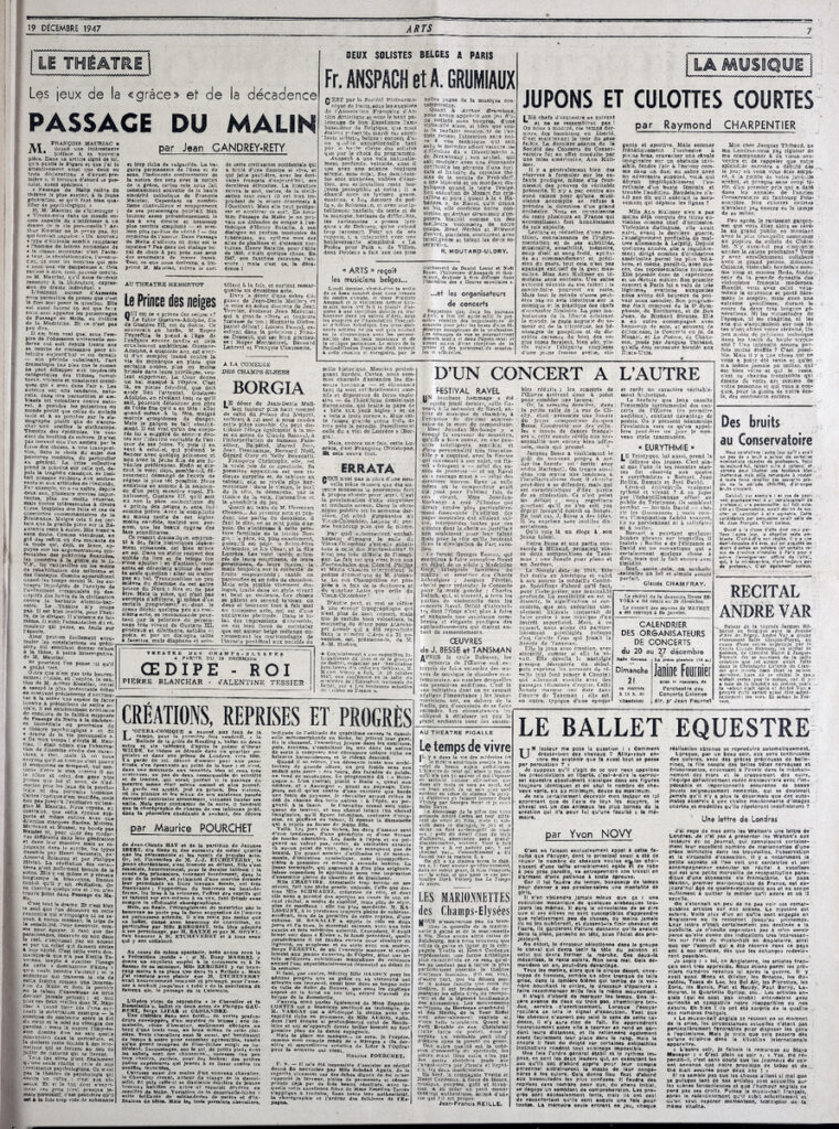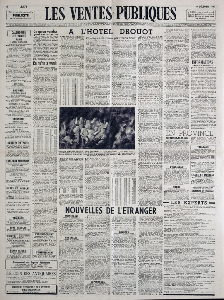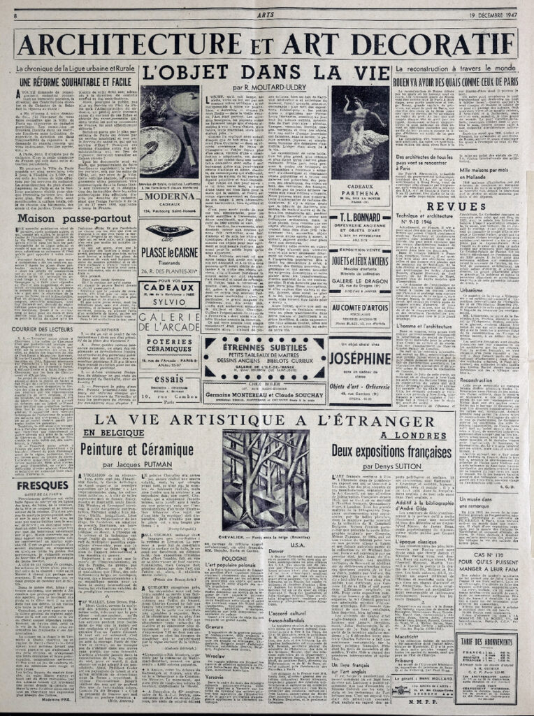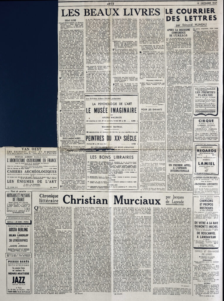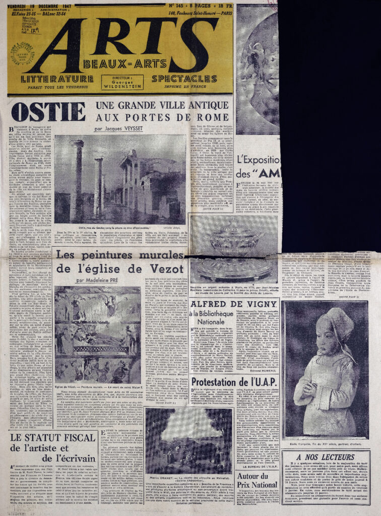 Έντυπο, στα γαλλικά, χαρτί, 4 φύλλα, 8 σελίδες, 60×43 εκ., όπου δημοσιεύονται άρθρα με τίτλους: J. Veysset “Ostie. Une grande ville antique aux portes di Rome”, M. Pré “Les peintures murales de l église de Vezot”, “A la farnesine. Les oeuvres d Art récupérées en Allemagne”, “L état actuel des Mantegna de Padoue”, R. Moutard-Uldry “L Objet dans la vie”, J. Putman “Peinture et Céramique”, D. Sutton “A Londres. Deux expositions françaises”.