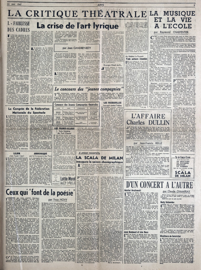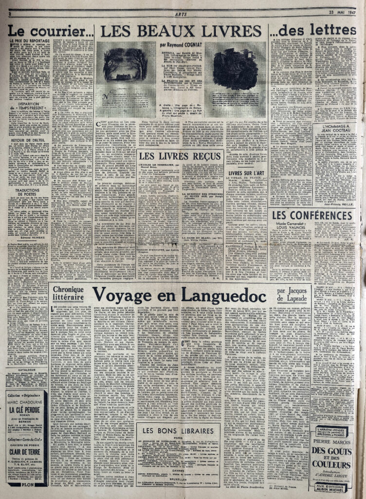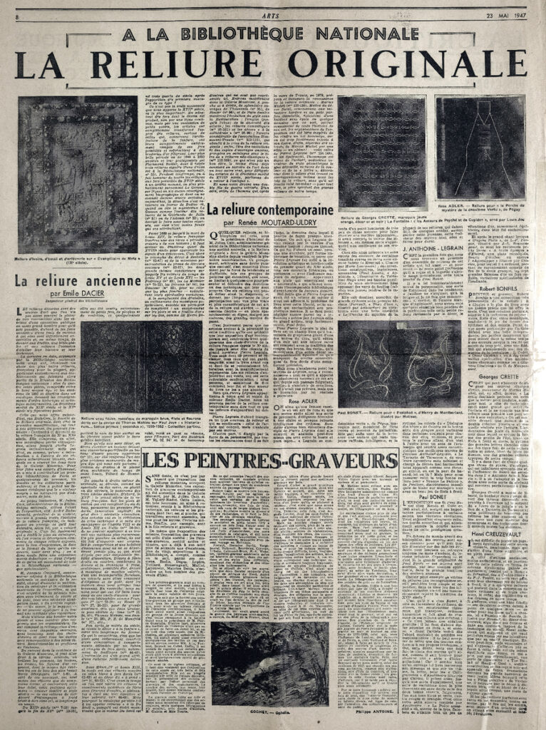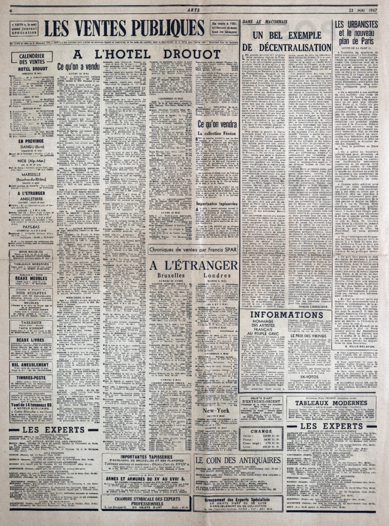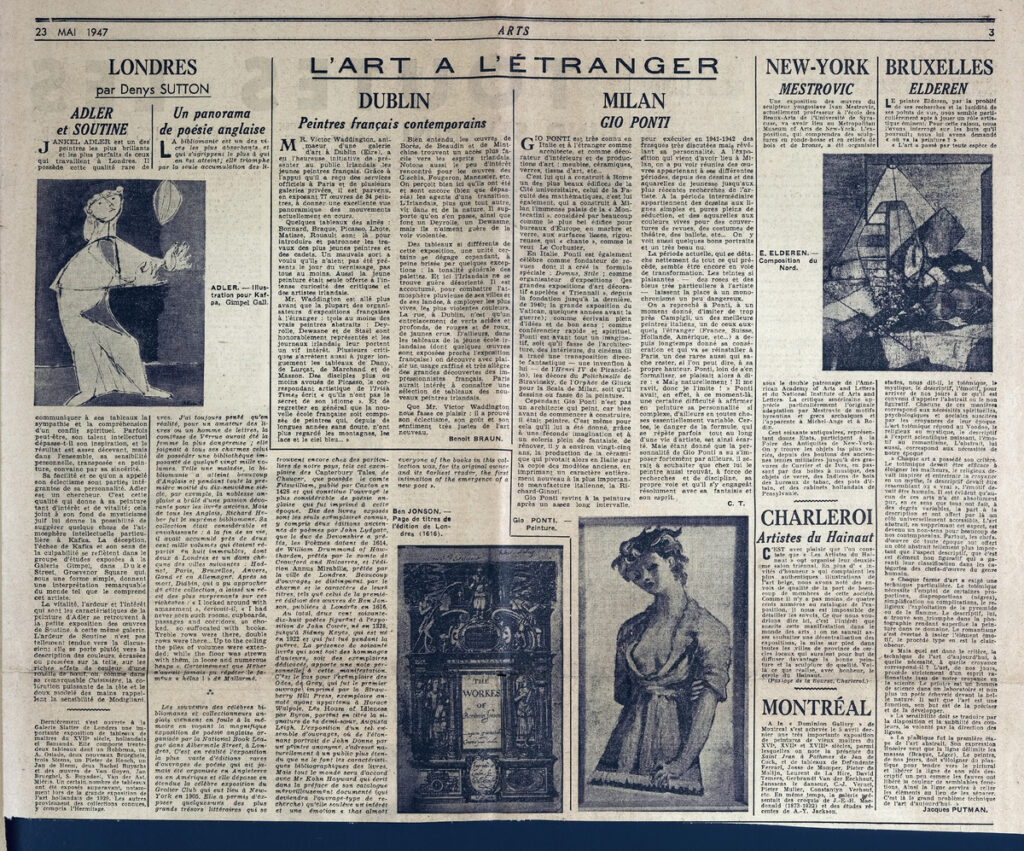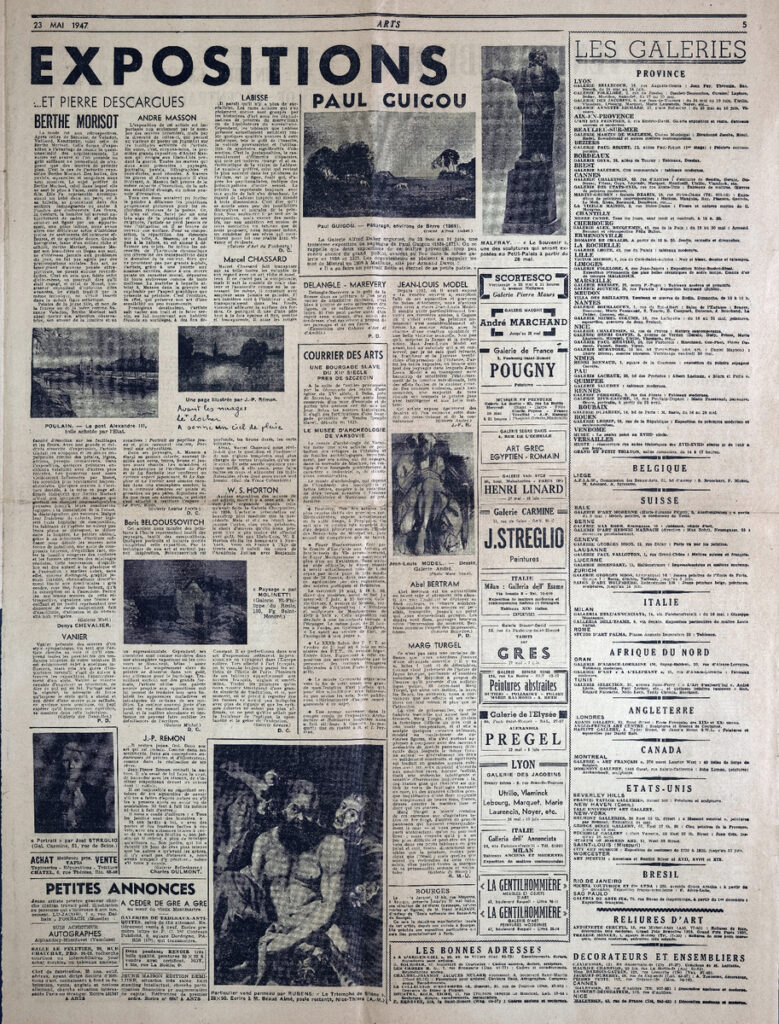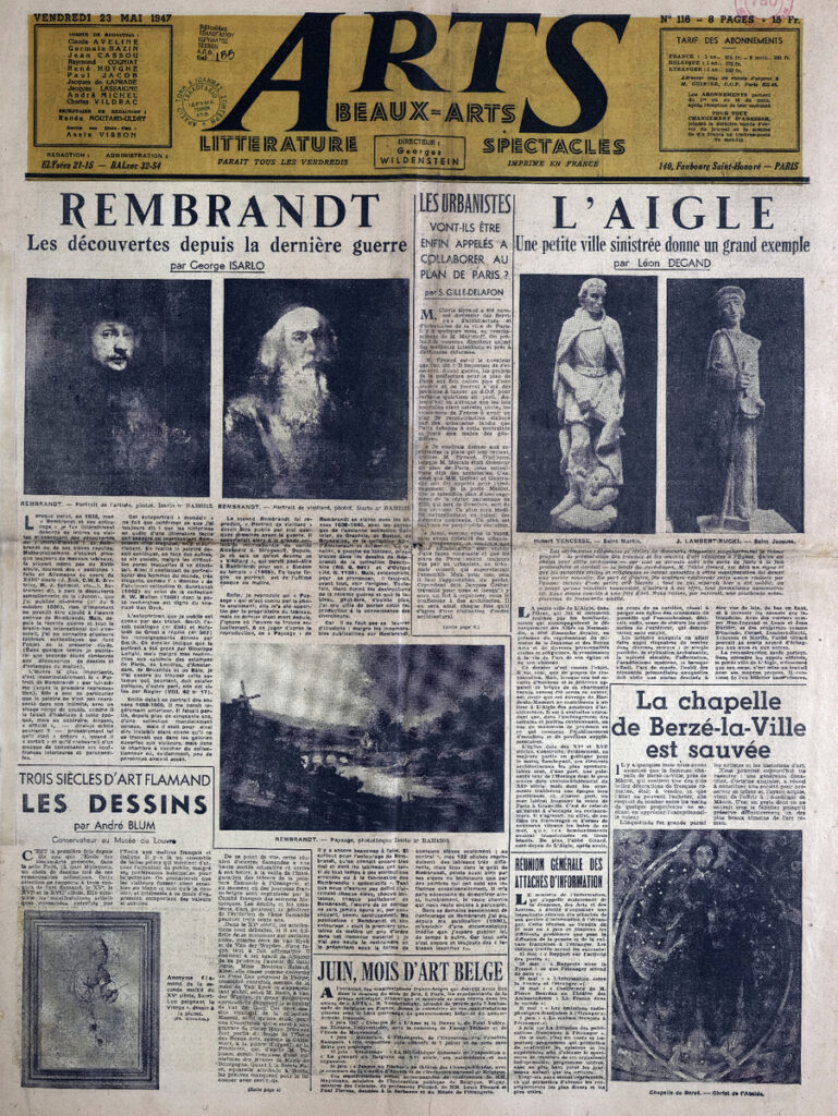Έντυπο, στα γαλλικά, χαρτί, 4 φύλλα, 8 σελίδες, 60×43 εκ., όπου δημοσιεύονται άρθρα με τίτλους: G. Isarlo “Rembrandt. Les découvertes depuis la dernière guerre”, L. Degand “L aigle. Une petite ville sinistrée donne un grand exemple”, “La chapelle de Berzé-la-Ville est sauvée”, A. Blum “Les Dessins”, D. Sutton “A Londres. Adler et Soutine”, C.T. “Milan Gio Ponti”, D. Chevalier, P. Descargues “Gino Severini, Berthe Morisot”, E. Dacier, R. Moutard-Uldry “La reliure originale”. Ph. Antoine “Les peintres-graveurs”.