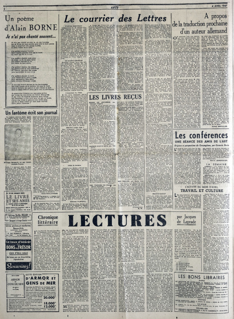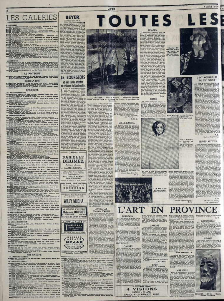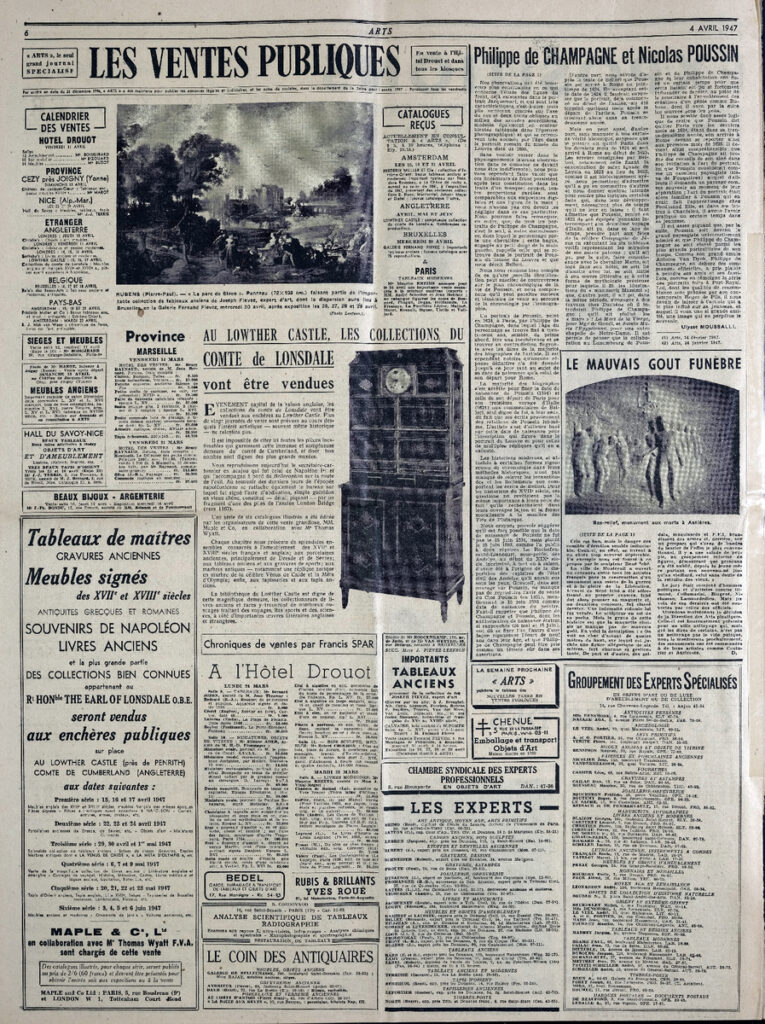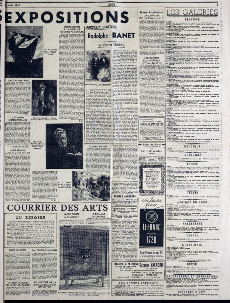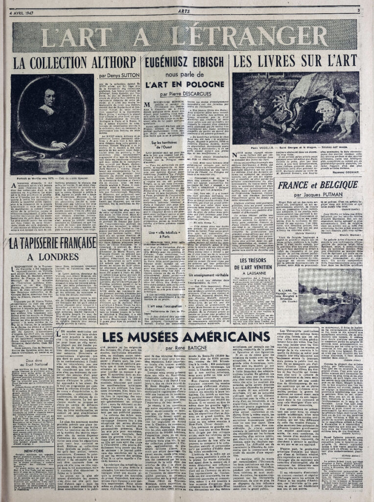 Έντυπο, στα γαλλικά, χαρτί, 3 φύλλα, 6 σελίδες, 60×43 εκ., όπου δημοσιεύονται άρθρα με τίτλους: U. Mussalli “Philippe de Champagne, Nicolas Poussin”, R. Mourtard-Uldry “Au Pavillon de Marsan. Paul Beyer et G. le Bourgeois”, D. Sutton “La Collection Althorp”, P. Descargues “Eugèniusz Eibisch nous parle de l’ art en Pologne”, J. Putman “France et Belgique”, R. Batigne “Les Musées Américains”, “La tapisserie française à Rome”, Ch. Vildrac “Rodolphe Banet”.