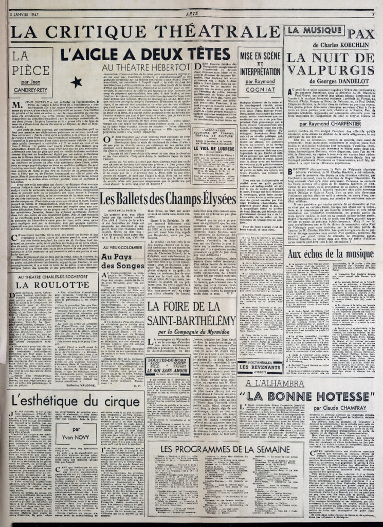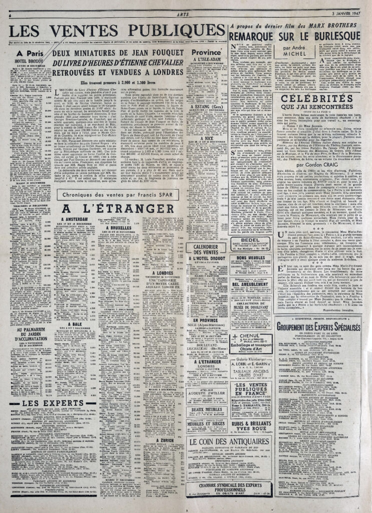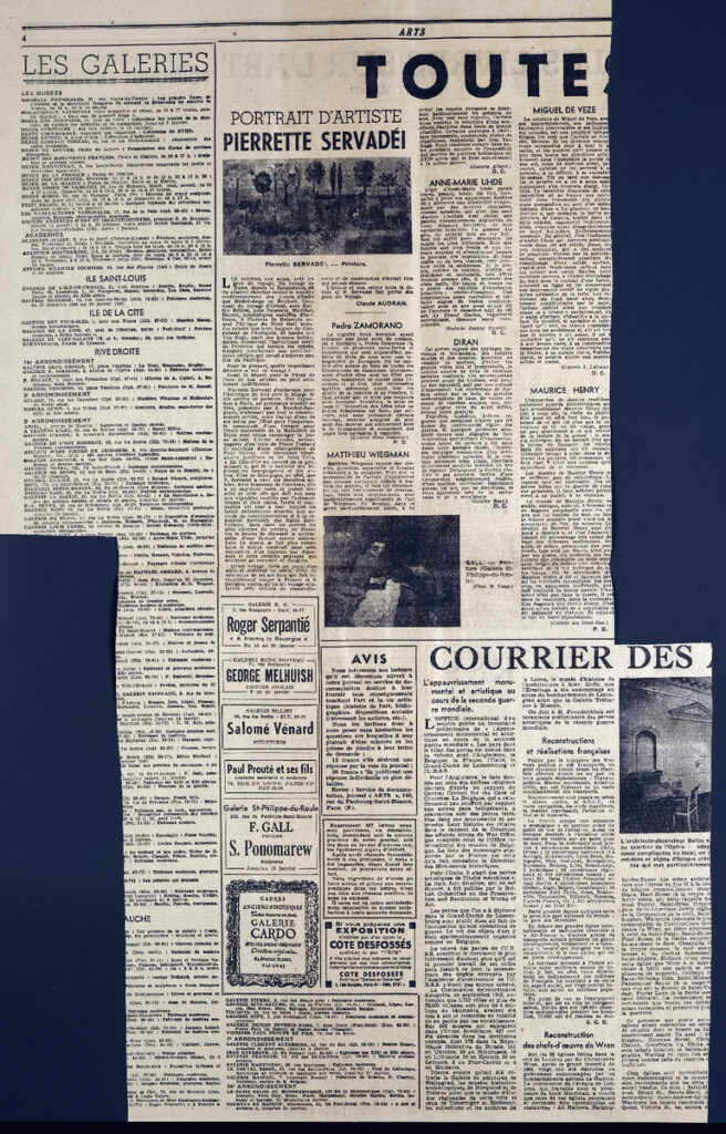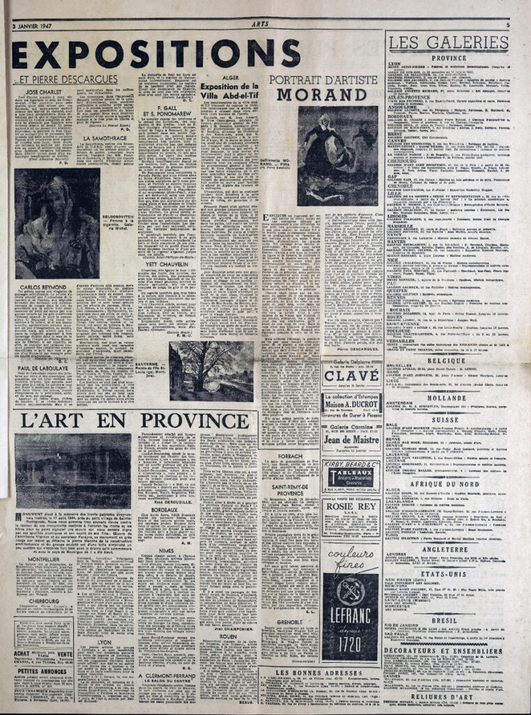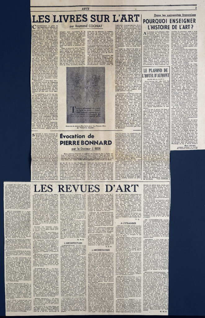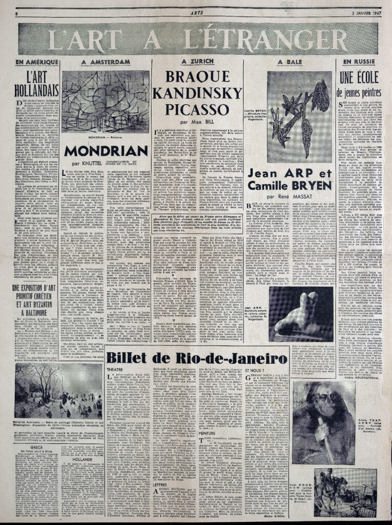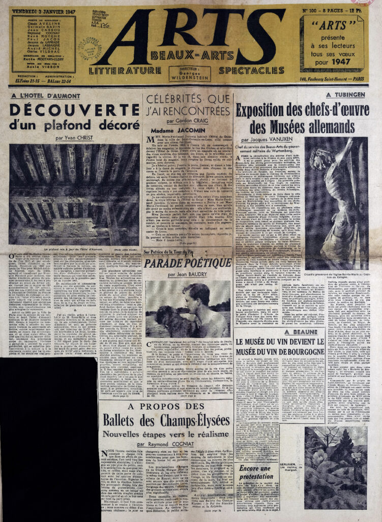 Έντυπο, στα γαλλικά, χαρτί, 4 φύλλα, 8 σελίδες, 60×43 εκ., όπου δημοσιεύονται άρθρα με τίτλους: Υ. Christ “A l’ Hotel d Aumont. Découverte d un plafond décoré”, J. Vanuxen “Exposition des chefs-d oeuvre des Musées allemands”, P. Descargues “Morand”, Knuttel “Mondrian”, M. Bill “A Zurich. Braque, Kandinsky, Picasso”, R. Massat “Jean Arp et Camille Bryen”, H. Kouznetzova “Une école de jeunes peintres”.