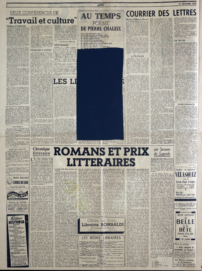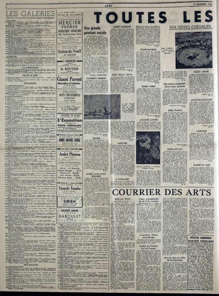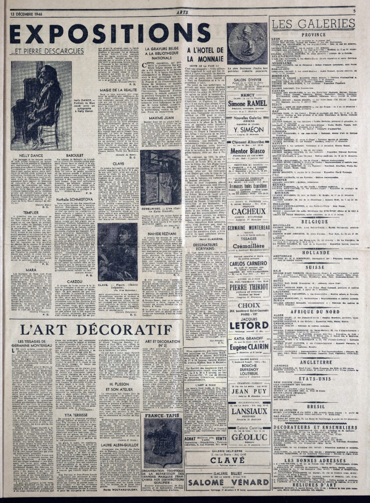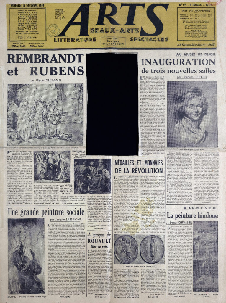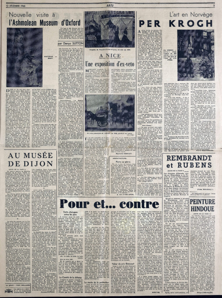 Έντυπο, στα γαλλικά, χαρτί, 4 φύλλα, 8 σελίδες, 60×43 εκ., όπου δημοσιεύονται άρθρα με τίτλους: U. Moussalli “Rembrandt et Rubens”, R. Cogniat “A Nice. Une exposition d ex-veto”, J. Dupont “Au Musée de Dijon. Inauguration de trois nouvelles salles”, J. Lassaigne “Une grande peinture sociale”, H. Classens “Médailles et Monnaies de la révolution”, D. Chevalier “La peinture hindoue”, P. Descargues “L art en Norvège. Per Krogh”, D. Sutton “Nouvelle visite à l Ashmolean Museum d Oxford”, L. Grodecki, L. Bezacier, A. Chastel “Fouilles Récentes”.