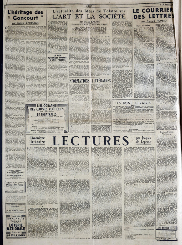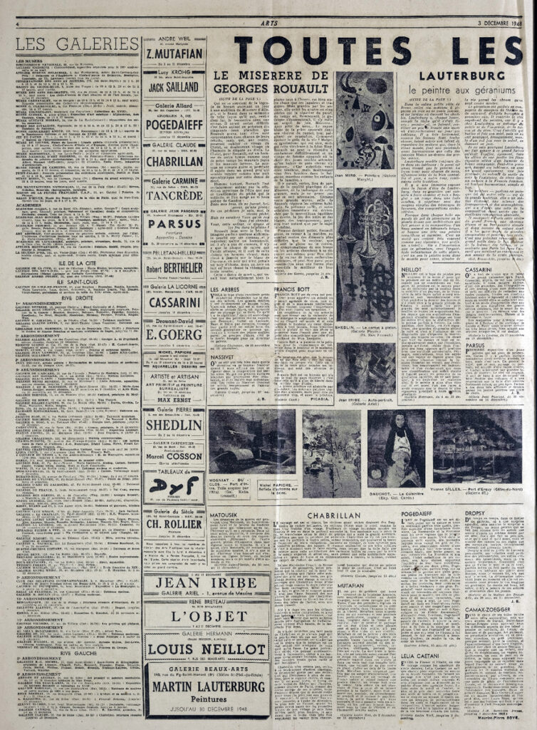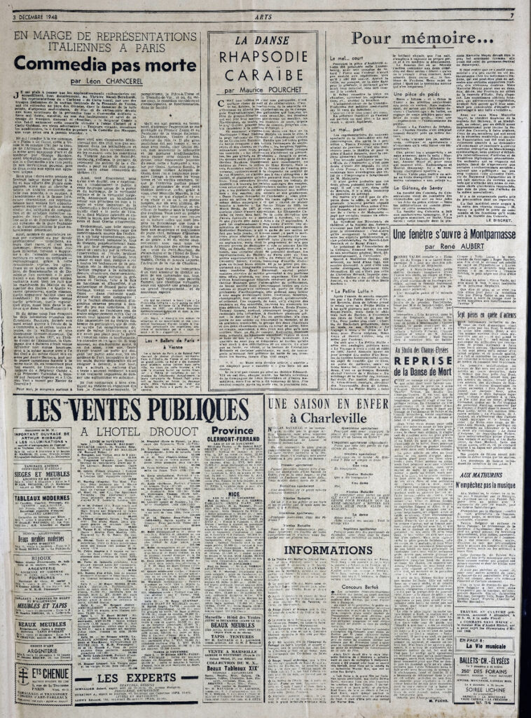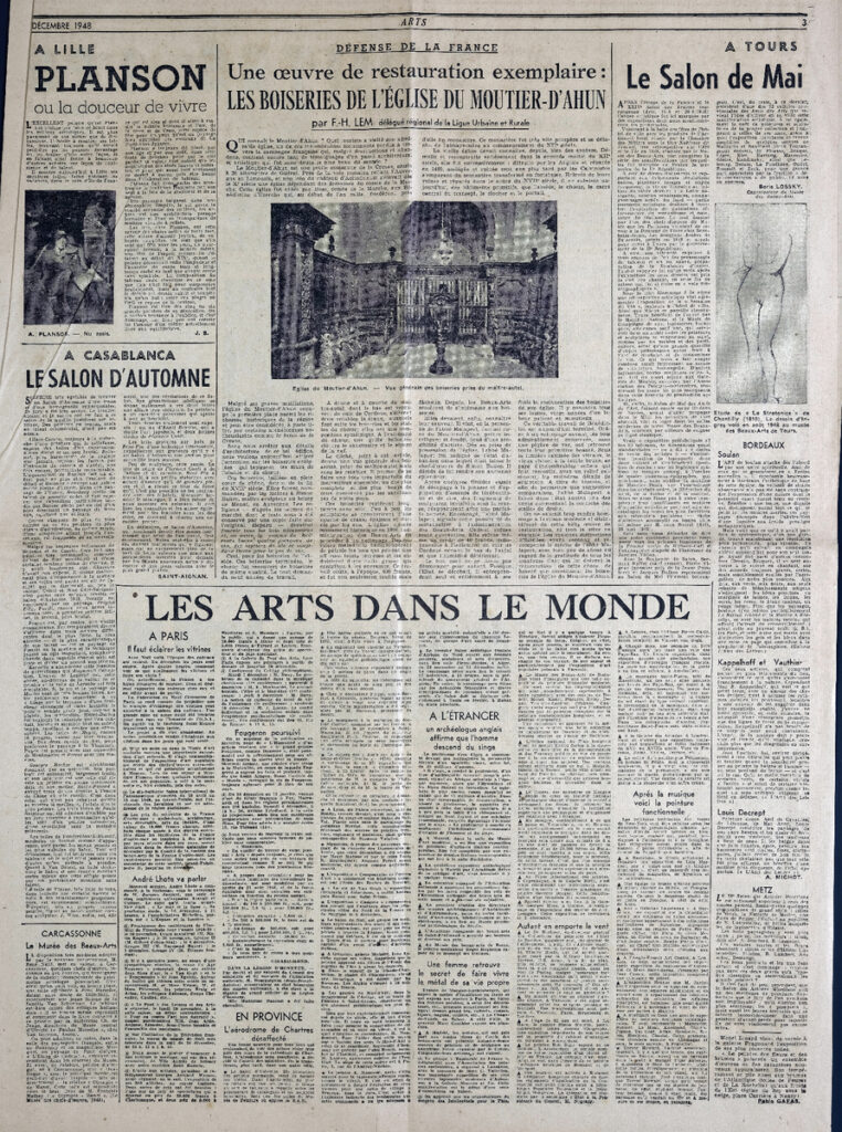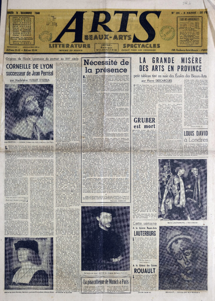 Έντυπο, στα γαλλικά, χαρτί, 4 φύλλα, 8 σελίδες, 60×43 εκ., όπου δημοσιεύονται άρθρα με τίτλους: Madeleine Huillet D Istria “Corneille de Lyon successeur de Jean Perréal”, Pierre Descargues “La grande misère des arts en province”, F.-H. Lem “Défence de la France. Une oeuvre de restauration exemplaire: Les boiseries de l Eglise du Moutier-D Ahun”, Saint-Aignan “A Casablanca. Le Salon d’automne”.