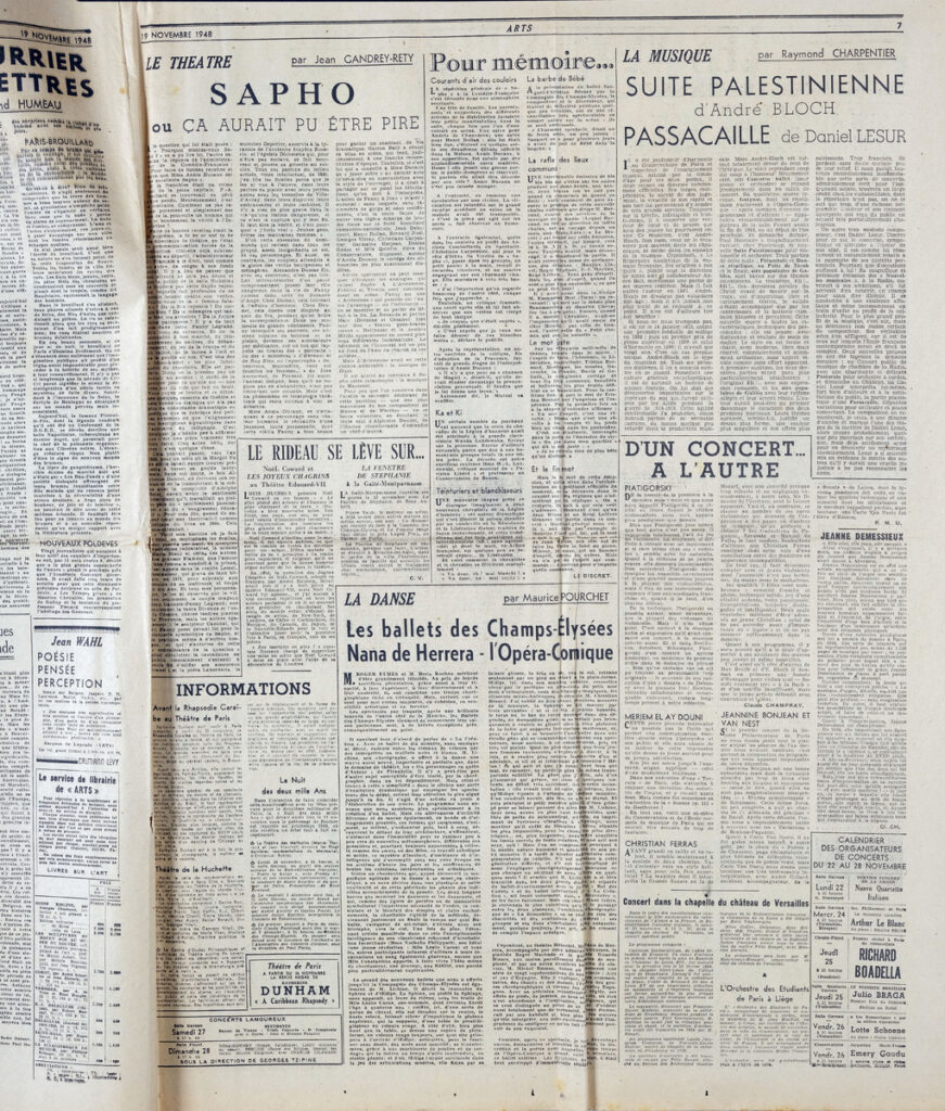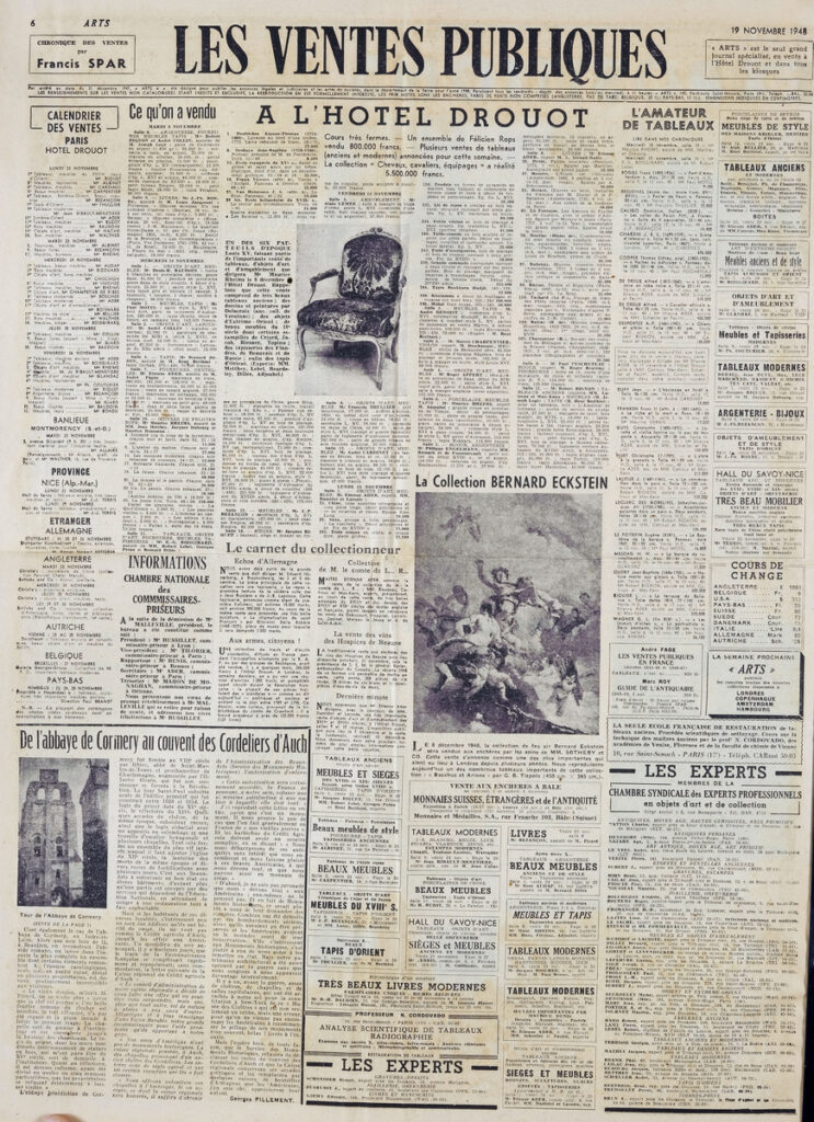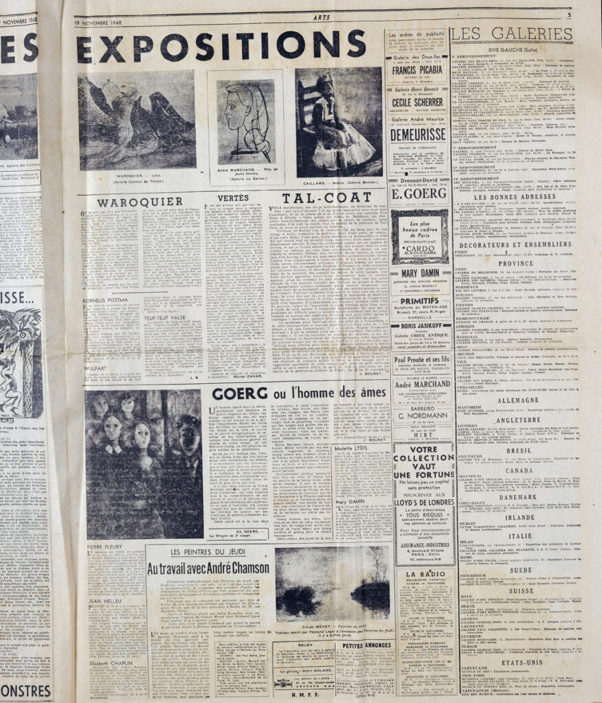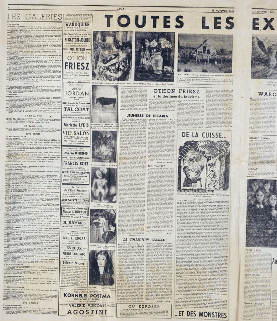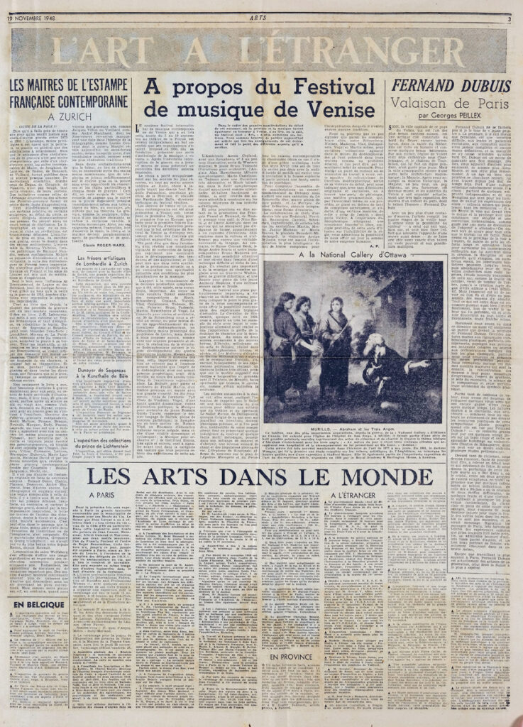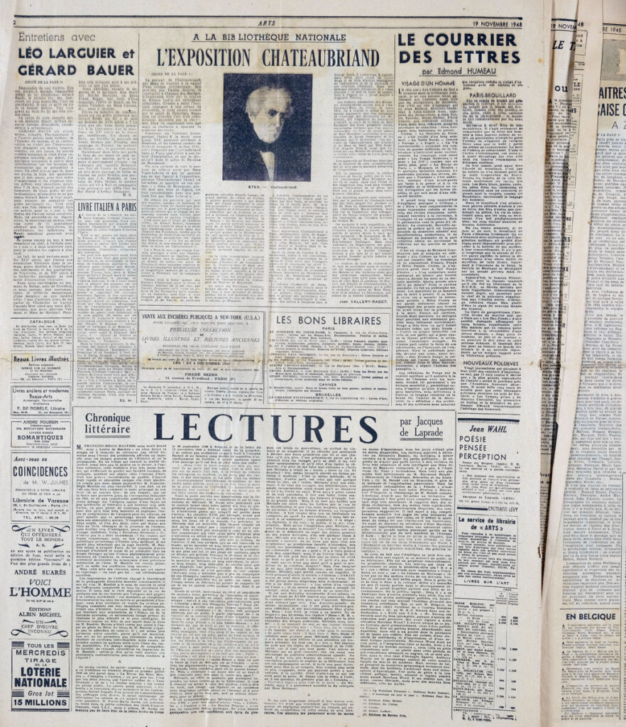 Έντυπο, στα γαλλικά, χαρτί, 4 φύλλα, 8 σελίδες, 60×43 εκ., όπου δημοσιεύονται άρθρα με τίτλους: Marcel Zahar “La Collection Veninac. Nous fai entrer dans l intimitè d Eug.Delacroix”, Denys Chevalier “Deux Acadèmiciens Goncourt perpétuent la tradition des frères collectionneurs”, J. Valléry-Radot “A la Bibliotheque Nationale. Le Centenaire de Chateaubriand”, Claude Roger-Marx “A Zurich. Une grande exposition des Maîtres de l estampe contemporaine”, Georges Pillement “Elginisme, Vandalisme et Incurie”.