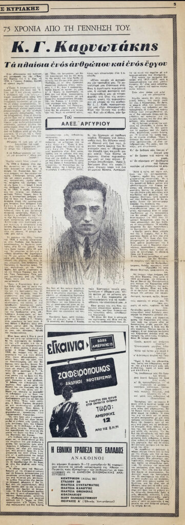 Απόκομμα της εφημερίδας “Το Βήμα”, δημοσίευσης άρθρου, αφιερωμένου στη ζωή και στην ποίηση του Κώστα Καρυωτάκη.