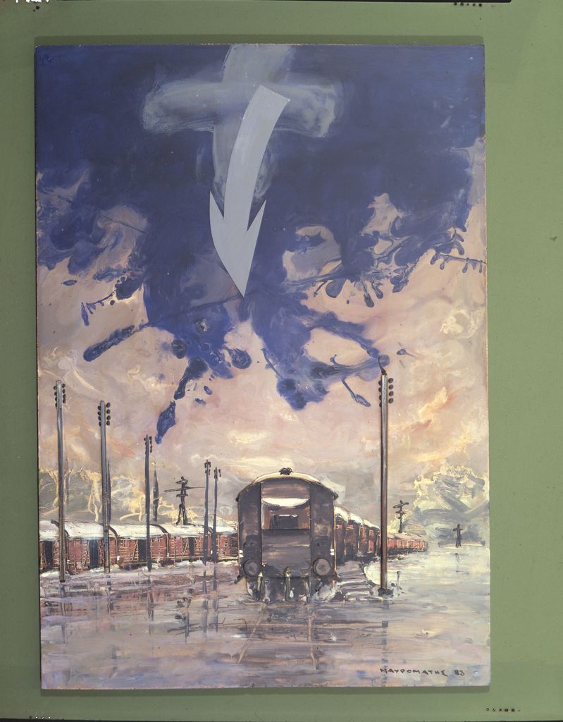 Σ. Μαυρομάτης. "Η πλημμύρα" Μικτή τεχνική (080Χ060) 1983 (στην ετικέτα, χειρόγραφη, με μπλε μελάνι, στα ελληνικά)