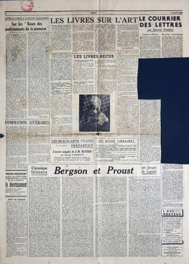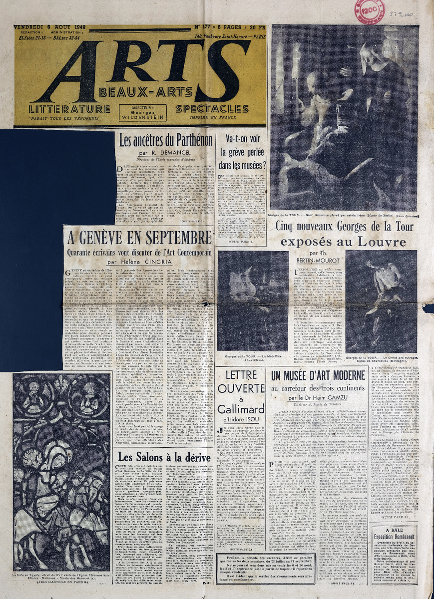 Απόκομμα, έντυπο, στα γαλλικά, χαρτί, 1 φύλλο, 2 σελίδες, όπου δημοσιεύονται άρθρα με τίτλους: R. Demangel “Les ancêtres du Parthénon”, H. Cingria “A Genève en Septembre”, Th. Bertin-Mourot “Cinq nouveaux Georges de la Tour exposés au Louvre”, Dr Haim Gamzu “Un Musée d’ art moderne au carrefour des trois continents”, Isidore Isou “Sur les «Bases des soulèvement de la jeunesse»”, “Les livres sur l’ art”, Jacques de Laprade “Bergson et Proust”.