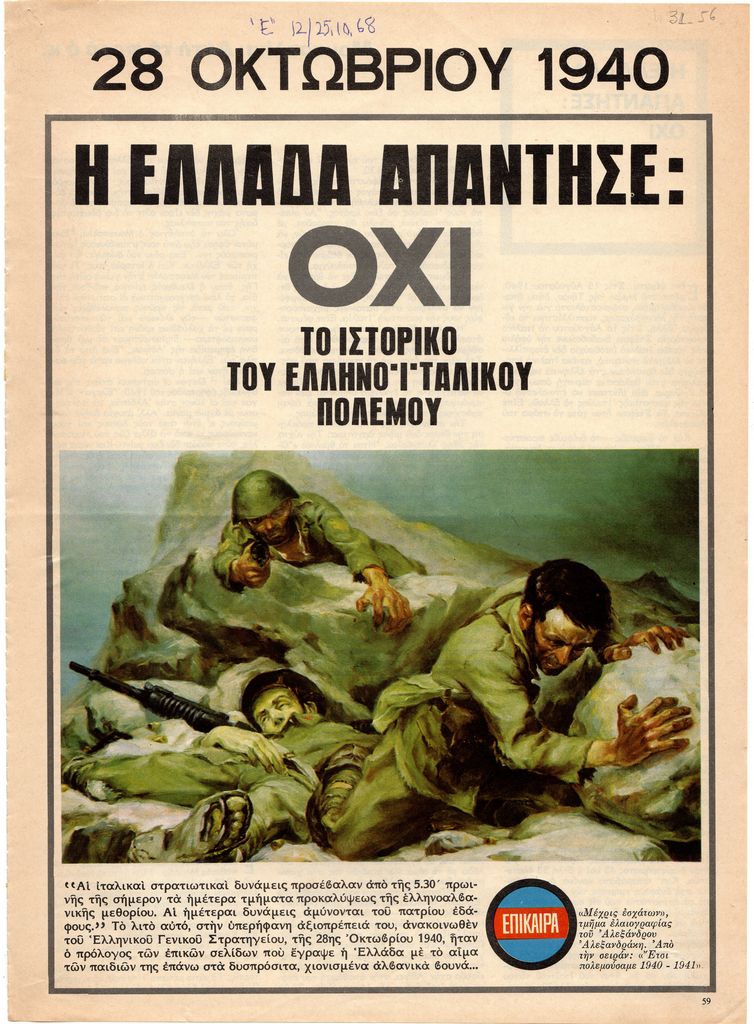 Απόκομμα, χαρτί, 5 φύλλα, στα ελληνικά. Δημοσίευση αφιερώματος του εντύπου στο Όχι’ των Ελλήνων. Γίνεται μια αναδρομή στο ιστορικό του ιστορικό του ελληνοϊταλικού πολέμου, ΕΠΙΚΑΙΡΑ, αρ. 12, 25/10/1968 (5 φφ).